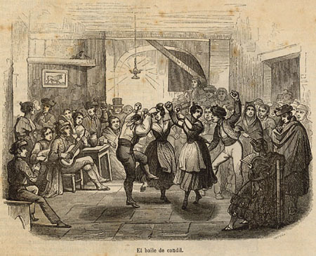 Fandango-Fiestas are usually the pastime for the weekends. On special holidays, or in festivals specific to each community they acquire a more ritualized character. In rural areas of Spain Fandangos are known as "bailes de candil" or candlelight dances (the image to the side is an engraving of the XIX century depicting the dance) These spaces are the first occasions in which courting relationships are established between adolescents. "Men and women usually were separated in different areas of gathering with a characteristic manner of men inviting women to dance. (...) They always constituted a particular type of symbolic authority for the occasion according to the traditions of each; however, fights often occurred due to jealousy" (Berlanga 2016, 18)