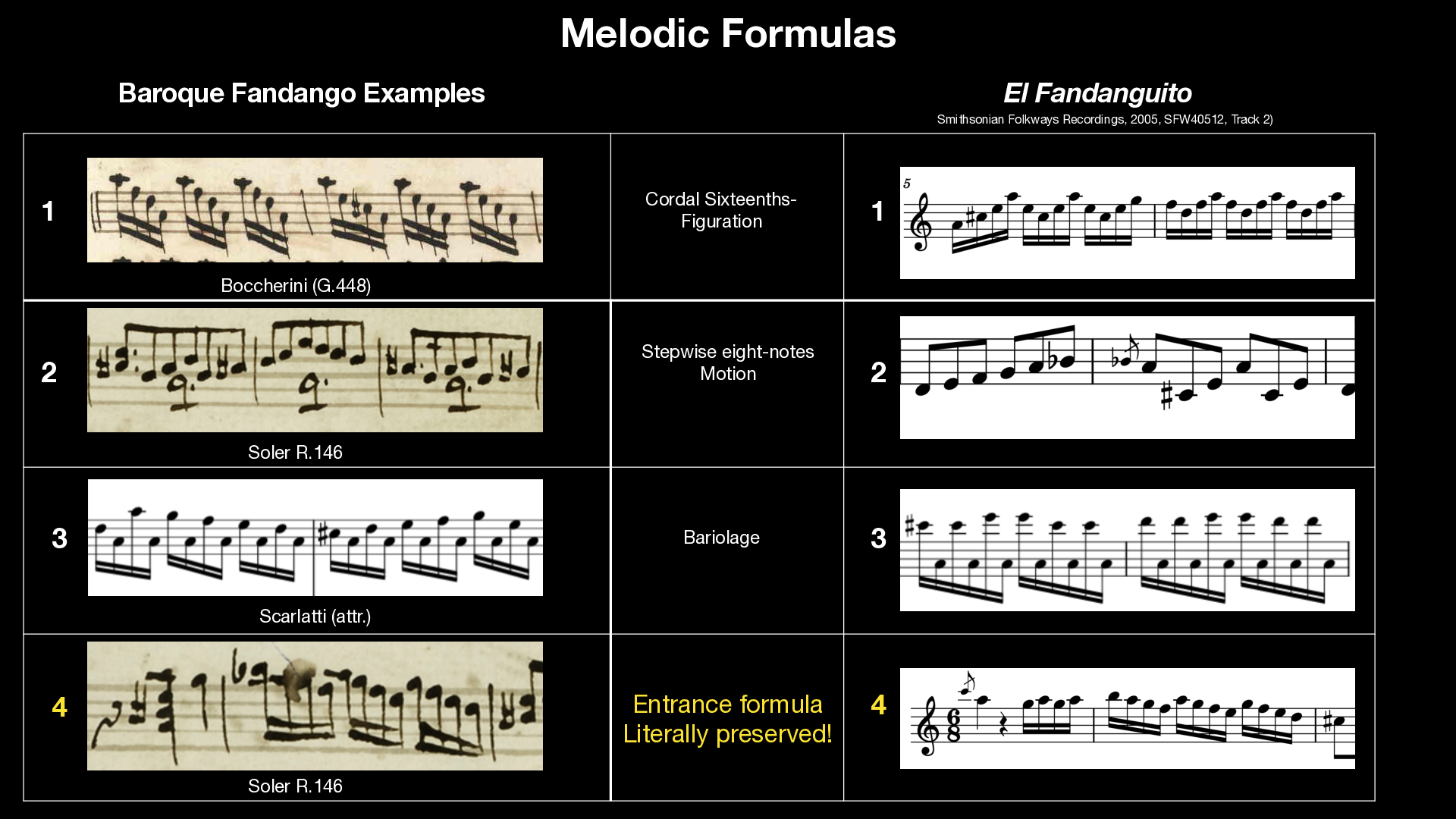 4: Most notably, I found in Soler the very same melodic formula Monroy uses to start "El Fandanguito" in the written example by Antonio Soler. In Soler´s example, which is particularly reminiscent of extempore improvisation, this melody is placed after a general pause, suggesting it was also used as a "starting cue" for the instrumental ritornellos, in the very same manner it is still used in the execution of "El Fandanguito"