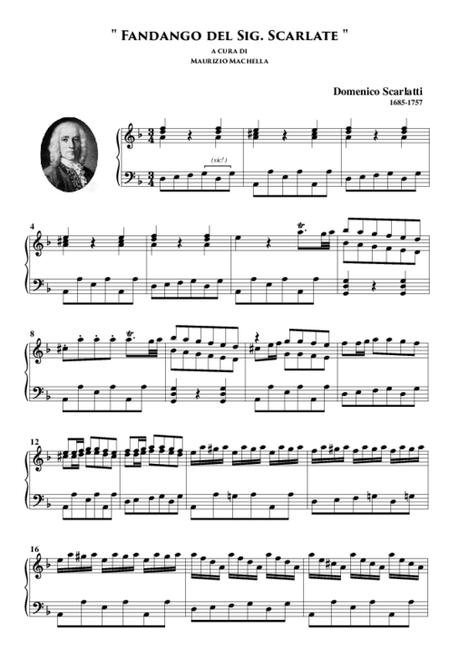 The piece starts with some bars of Santiago de Murcia´s guitar-fandango played on the violin, in the manner of a solo-violin piece. The rest of the instruments come in gradually, creating a build-up until the introduction of the emblematic chords of Domenico Scarlatti´s Fandango (Gm- Am in bar 44). Typical chordal sixteenth figuration is used to connect sections.