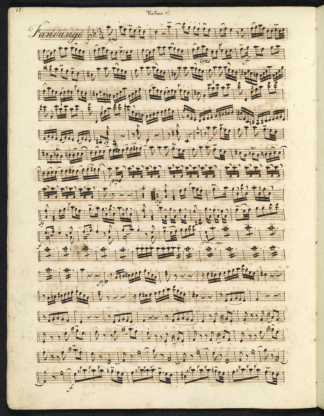 1: Chordal sixteenth-notes figuration: arpeggiated chords of tonic and dominant in every melodic position (upwards, downwards). This is the most distinctive element and recalls the instrumental figuration of XVIII century European music, as found for example in Italian violin music.