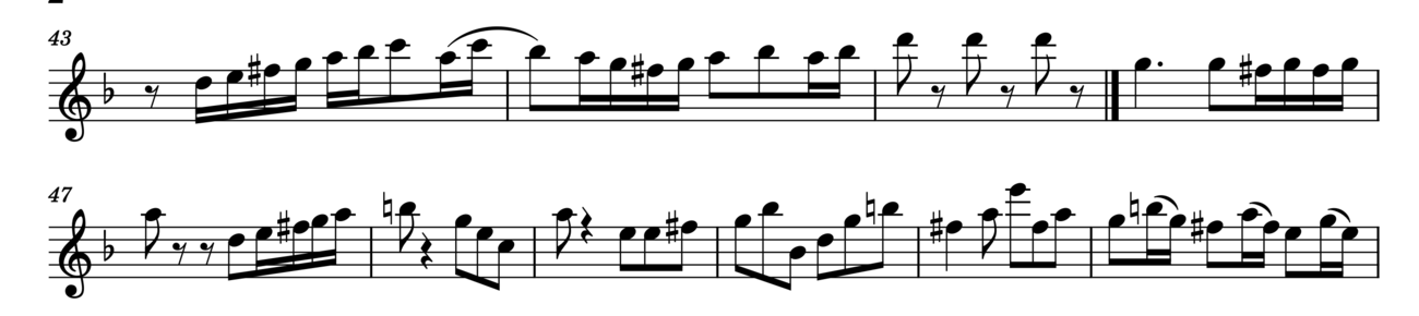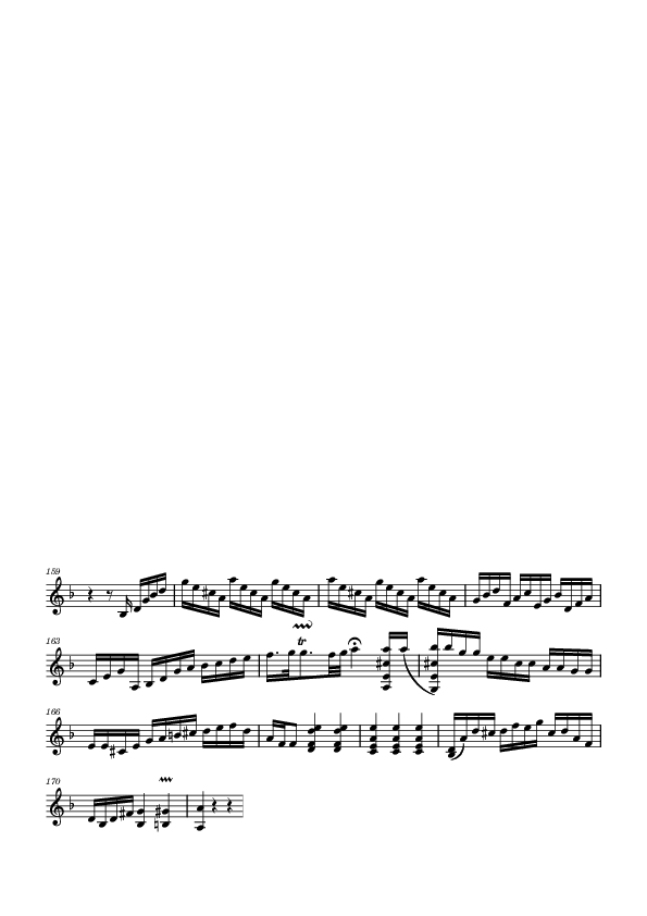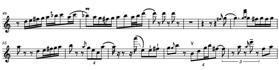 There is a big presence of grace notes and trills, which reinforce the rhythmic character of the violin line, as found in quick French dances from the XVIII century. All of the grace notes are executed quickly, with a smaller value than the main note (historical performers would call this "Lombardic" rhythm, as in XVIII music resembling northern Italian style). There was a big amount of grace notes recalling the "tierce coulé" found in French music from the XVIII century, that is, an ornament filling in an interval of a third.