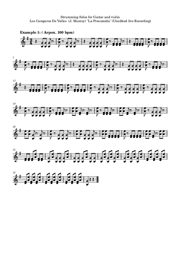 The performance of strumming patterns on the violin was popularized by famous Venezuelan violinist Alexis Cardenas in his recordings of Joropo music. This technique became a distinctive feature of the crossover style created for the research. In the next chapter, I will go more in depth on the subject of Joropo or "llanero music", and the experience learning to perform the "cuatro".