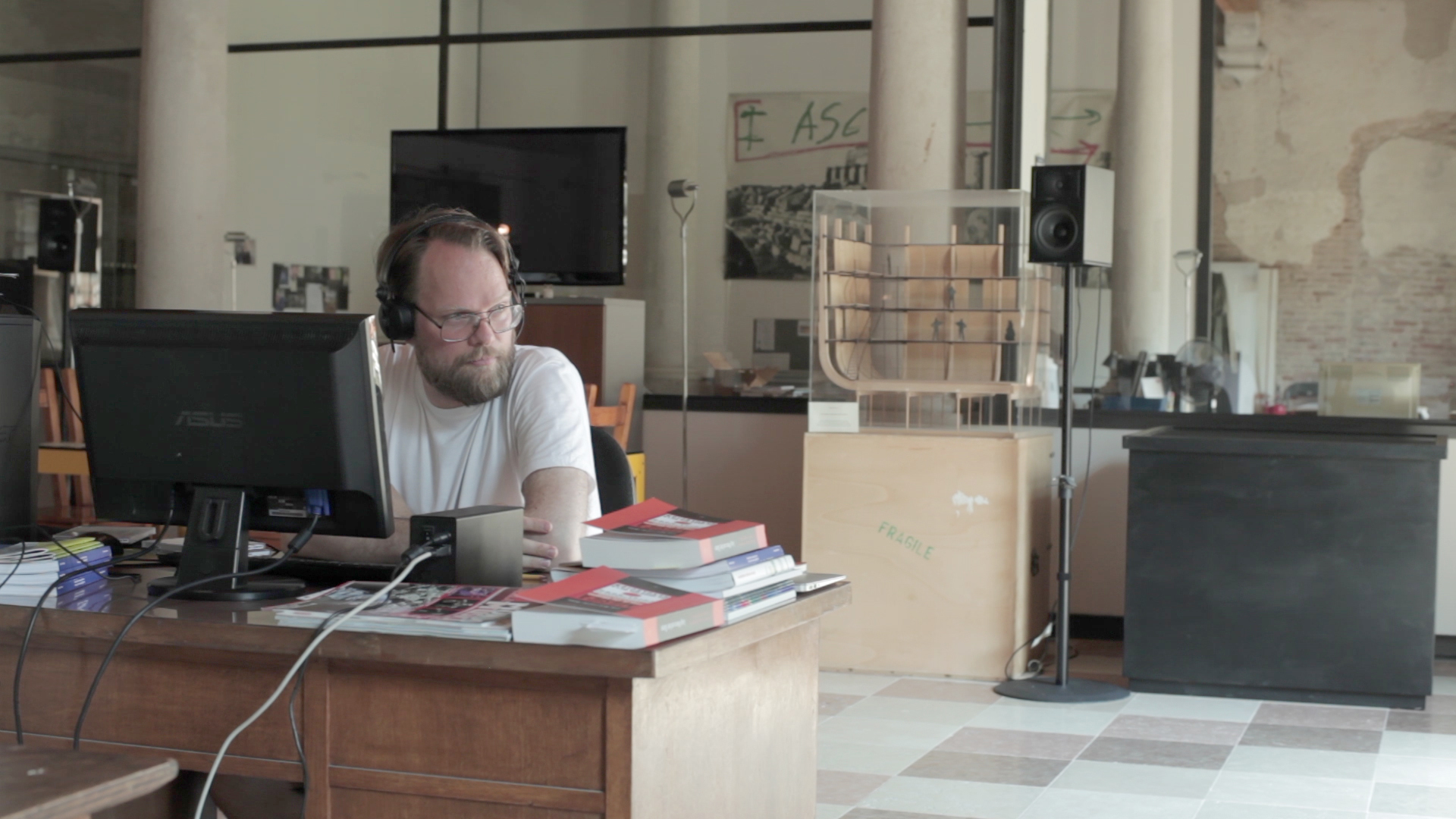Due to restrictions, physical materials from the Nono archive can't be copied or removed. Thus, human memory became the sole carrier of musical material. Initially, Habbestad listened to and memorized archived recordings of Nono's music and the performances of flutist Roberto Fabbriciani. Subsequently, he reproduced this material in the vicinity of the archive, with Røed documenting the process using a camera and microphone setup. This recording then informed a subsequent performance, where Habbestad first listenend to the recording and then performed the music, integrating his own interpretation of his memory of the recording as well as local resonances occurring in the new site during the moment of musical articulation, or performance. This was then recorded and the new recording informed, in the same manner, the next articulation in the next site. This iterative process continued across various locations. Sound and video recordings served as proxies, facilitating dynamic interactions between place, sound, video, and people.