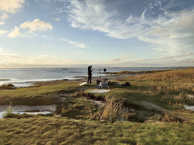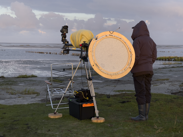 The field recordings of the project KOMPASS were made in various forests, forest plantations and forest seed archives, as well as on Mandø, a small island located in the Wadden Sea, part of a tidal zone that extends from the Netherlands, along Germany and up along the coast of Jutland, Denmark. The rising and falling of the sea on the island means that it is connected with the mainland only when the tide is at its very lowest. The tides of Mandø and the constant and changing winds that sweep through both its shores have become part of the method, shaping the language and the attentiveness of the fieldwork of Røed and Lidén. The local and localised experiences of the sites, the island and the forests, enable new understanding of being present, of observation in a recording situation, and also in different situations that are connected to it such as looking, hearing, carrying, rigging and balancing. These experiences are mediated through the recording equipment, the rig, and stored in the recordings.