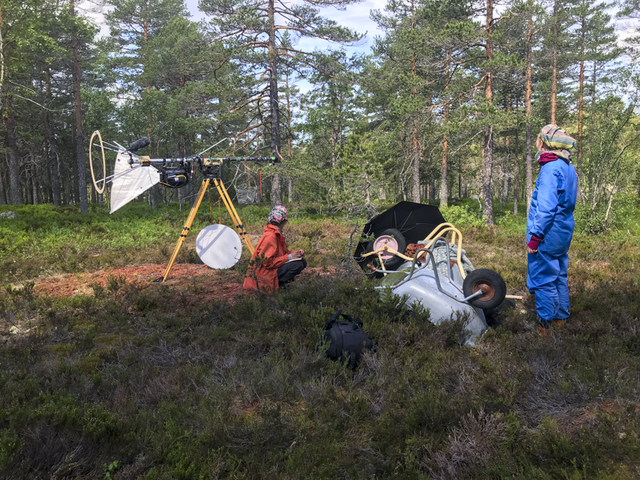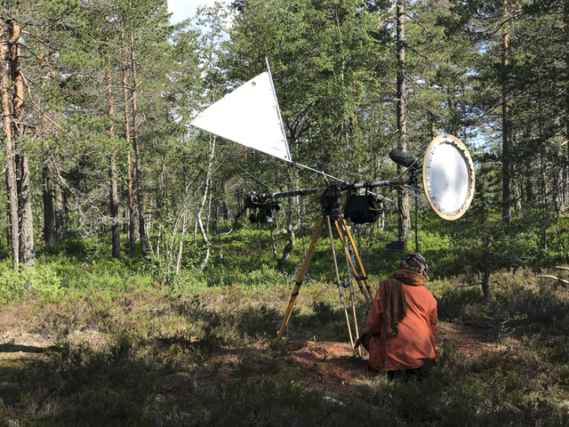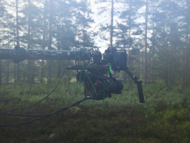 Adjustments of focus are performed by the cameras themselves, in interaction with the light as well as the movements in both the forest and of the rig, caused by wind and gravity. By combining equipment from the film industry, such as jib and other devices for camera movement from film, with a mode of thinking found in the practice of field recording in sound art, the artists challenge these practices and highlight an approach to recording that, through attention, time, listening, adjustment and experience, takes into account the active connections that sound and images form; relationships between the operators, their bodies and the devices as they all work together and form an environment.