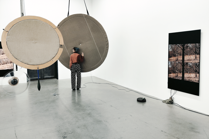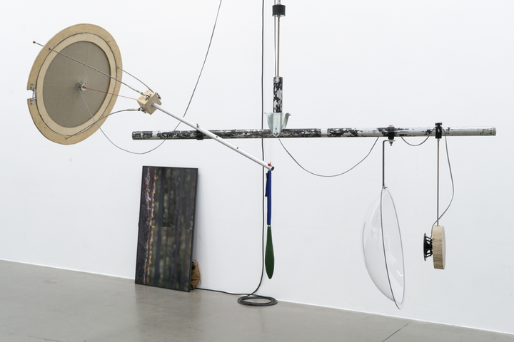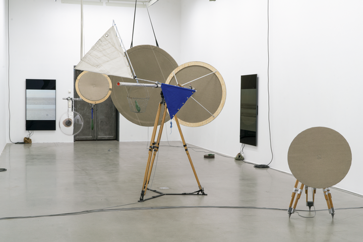 Both the sound material and the sculptural structures in the exhibition space are organised in accordance with an ambition to activate the recording situation and form zones where the audience actively form part of the sites that emerge. Some sounds are closely connected to what is happening on the screens, for example as the rustling wind pulls on the rig and renders a turbulent movement in the images, while other sounds reveal what occurs behind whatever is happening in the picture, such as adjustments of the mechanics of the rig, realigning the balance (by adding objects to the attached wire basket) or the rustling of clothes, whispers. A similar shift can be experienced when lowering one's head towards a linen membrane, focusing one’s listening closer to the vibrations of the sound in the linen, where the frequency spectrum is expanded and the field opens up a larger spatiality.