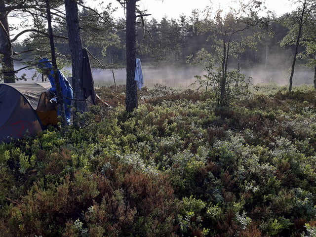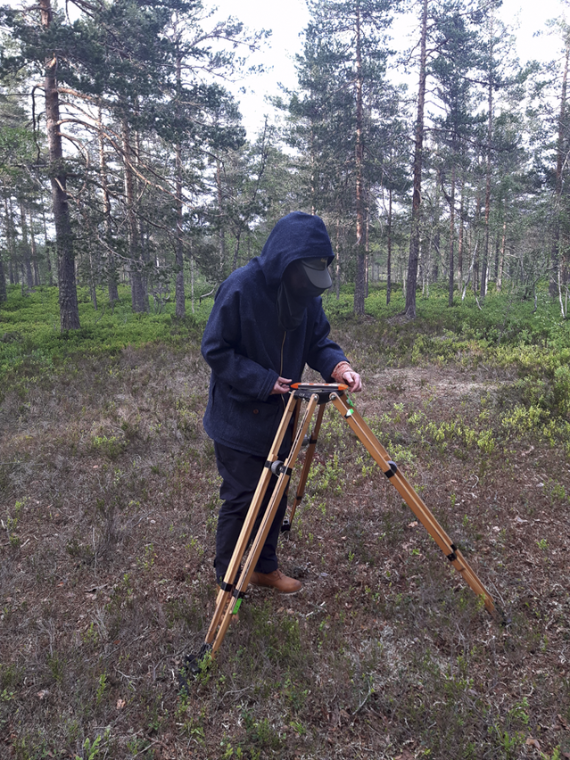 Over several periods between spring 2020 and autumn 2021, Røed and Lidén worked in an old-growth forest near Gravningen in Finnemarka, on an elevated mountain plateau high above railways and car-traffic. The mixed forest here has a rich bird and insect life, and the moss-covered forest floor has large fields of cranberry and blueberry bushes. They had found a site a few kilometres from the nearest road were they stayed with the rig during periods of recording. Making coffee on the primus, adjusting the cameras or setting sound levels, every task was undertaken while being attentive to the rig and its surroundings. The close listening to the forest continued through the nights and days. For the few hours between dusk and dawn, they would install themselves in hammocks in the trees surrounding the rig. When unpredicted rain showers, fog or strong breeze occurred, the nights were spent adjusting and safeguarding the rig. In response to their first excursions, Røed designed and sewed wind-, rain- and insect-proof clothes with an outer layer of sound insulating wool, clothes that would ease the experience without impacting on the sound recordings. This forest, situated deep within Finnemarka, is maybe the only location that can strictly be called a forest; not a mono-cultural plantation of trees but an old and rich ecosystem with a diverse range of species and high density of trees. Ironically, on the audio recordings from the first day of shooting, in June 2020, there is a constant presence of a timberjack and the sounds of falling trees in the distance.