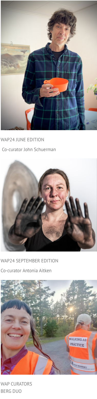 The exposition is set out to present individual artist's endeavours presented in chapters by each artist. The methodology is based in SHARE SESSIONS (participating artists only) and PUBLIC PROGRAMS. It concludes the dissemination of WAP24, where each artist presents their own exposition. In addition to framework by curators as welll as concluding texts, each page holds the image WAP24, which brings you back to the baseline page.