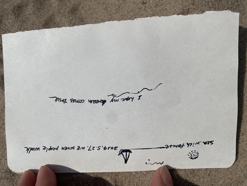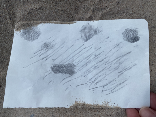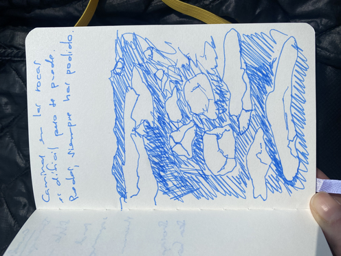 May 27, 2024, Cliff and I guided a collective walk throught the shore from Östersjö to Simpnäs. The first idea that came to my mind for activating this experience was to create a collective walk through the water. This is an exercise I did myself alone in the same beach last year, now this time the place where we landed to rest, after a challenging walk through the rocks. After a couple of hours crossing the sea coast we arrived to the white and soft sand of Rumshamn. Before engaging the group into the collective performance, I invited everyone to put in drawings or/and words this first part of the journey. My aim was also to create a solemne atmosphere before coming all together to the water. I was creating this space in time as I always miss during my walks a moment to sit and reflect in situ, a way to organize feelings in a concrete way in the sketching book due to the fear of forgetting or letting these sensations vanish. Some of these impressions were shared and I took photo of them to create an archive of the moment. It was for me a silent situation where we were not talking but somehow creating a dialogue as we were all sitted, resting and communing with the same activity.