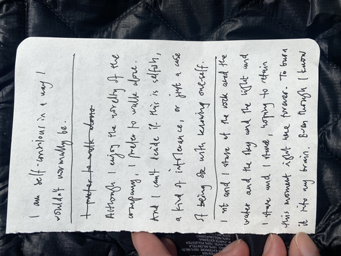 And I tell him that this presence is what I feel on the exposed shore. The concentration required to navigate a path. The absence of thought. And Bernardita has the opposite experience. Of being so fearful of falling on the rocks (and smashing her teeth) that her mind is consumed with worry and anxiety. And we marvel at how an environment can engender such different responses. And discuss the experiences engendered by different paths. How the meditation is absent on a road or a well-trodden track - the path so easy that it is the mind that is free to wander.