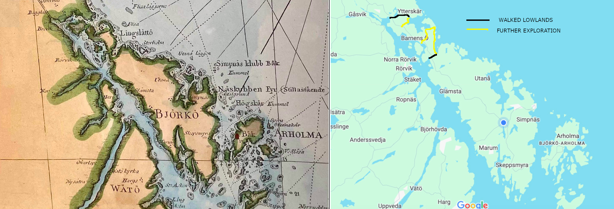 I walked where the sea used to be. Sweden has been rising out of the sea at a rate of 9mm/year since the last ice age when the glaciers receded. This is now offset by 3mm/yr. of sea level rise due to climate change (so net rise of 6mm/yr.). In the last 150 years Sweden has risen about 1 meter. Not that long ago, maybe 200 years, Björkö where I am now was separated from the mainland (and the island of Väddö). Click on the old/new comparative map to see this.