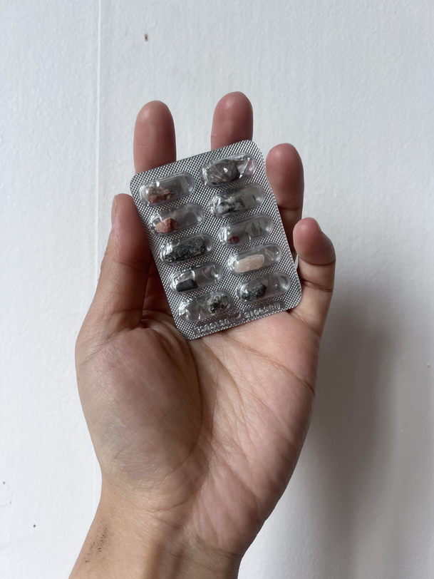 I explored te intersection of nature and mental health. Each day I took my fluoxetine for depression I have been struggling with for years, I replace the pill with a small stone collected from the island, reflecting on the emotional burdens we carry and release. The stones now fill ane entire blister pack (a month dose ), becoming a visual metaphor for healing, routine, and the weight of depression.