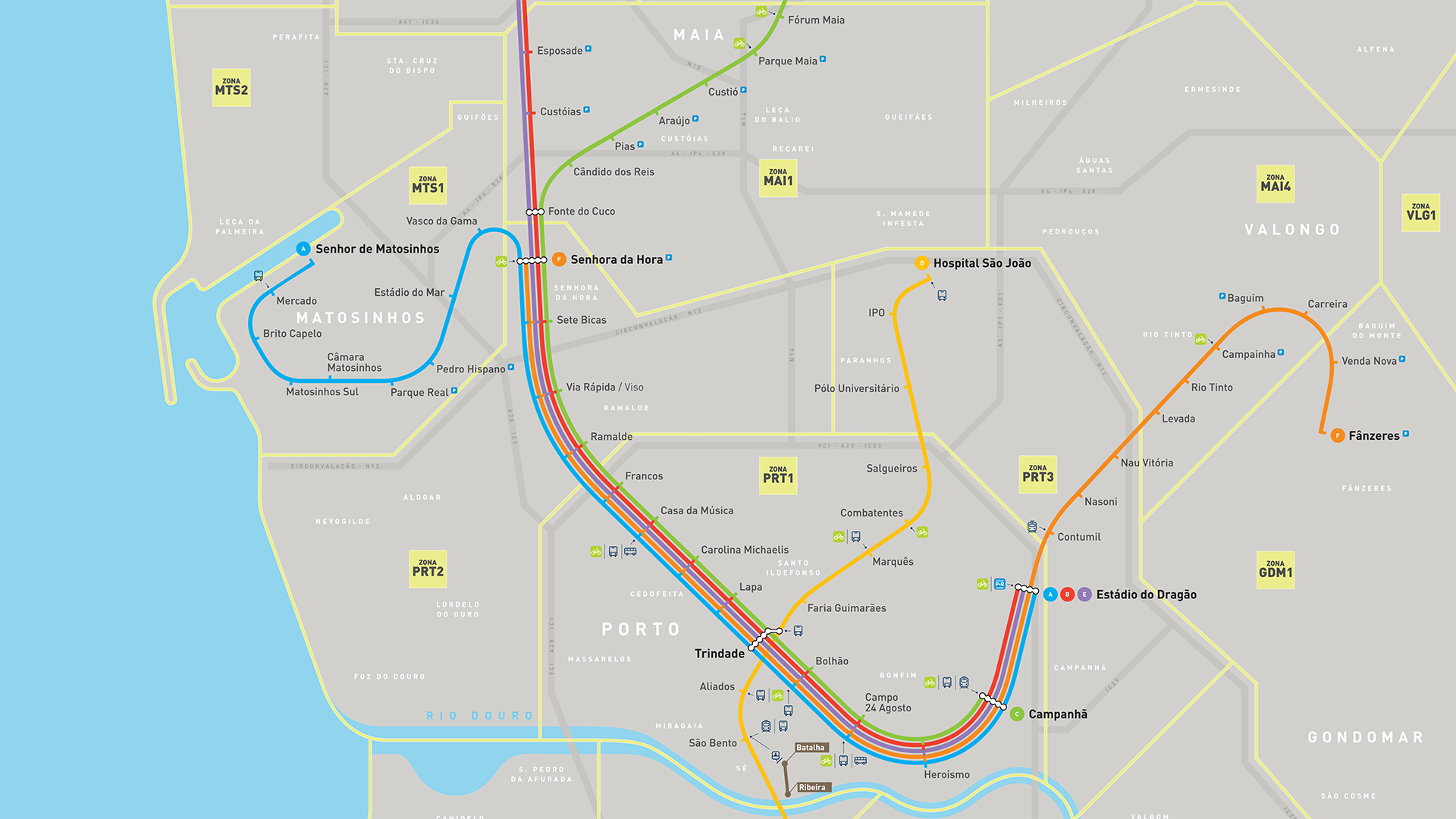 Line E (Violet) connects the airport station to the "Estádio do Dragão" (FC. Porto Stadium) and the entire metro network.