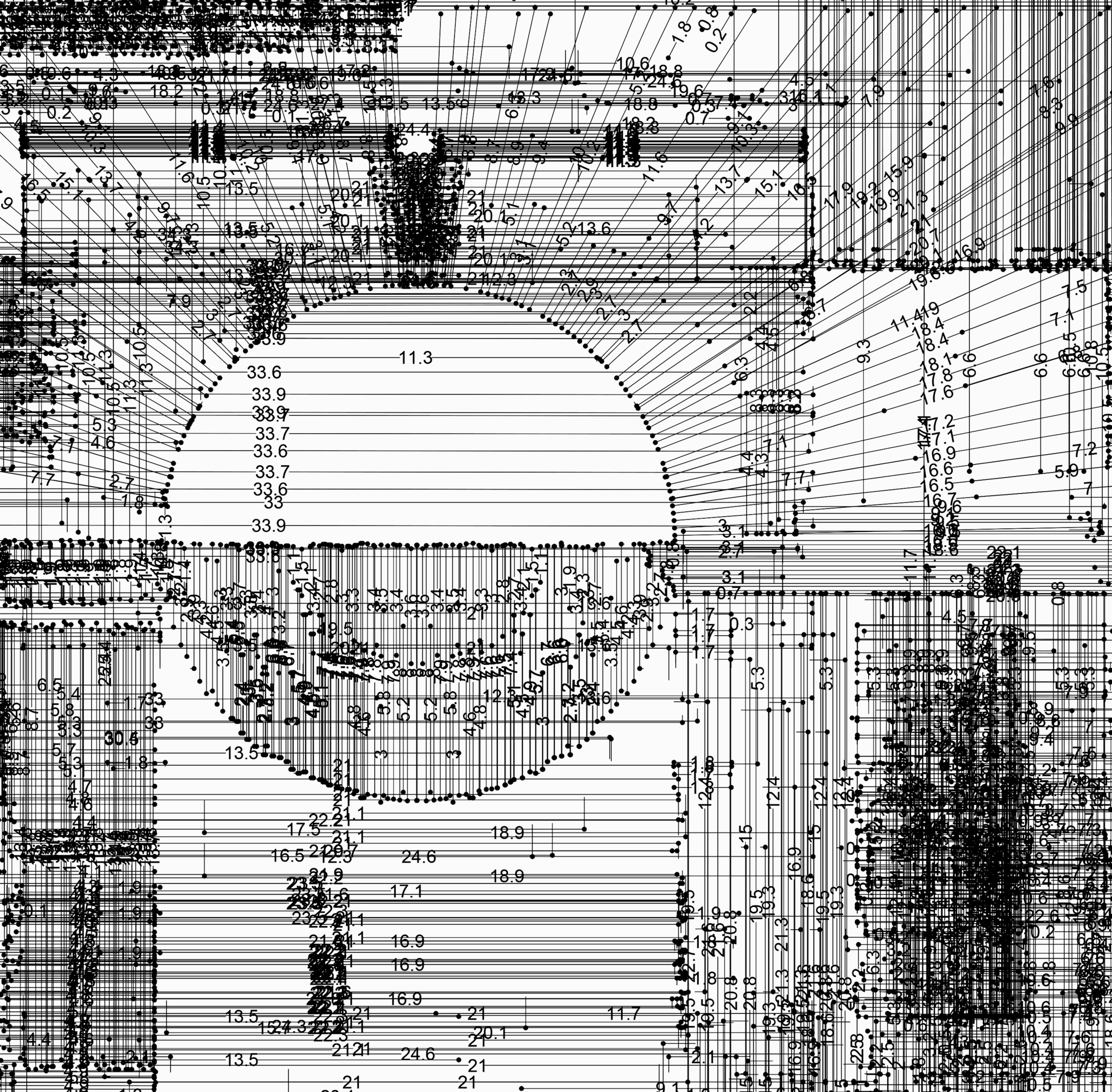 The presenters discuss that the drawings produced offer qualities beyond conventional methods. Lacking clear geometric outlines, they prompt viewer engagement through memories of iconic buildings as well as imagination and subtle cues within the assembly of dimension lines. Stark white lines against a traditional blueprint-like backdrop intentionally defy the typical CAD image. Each dimension line contributes to the overall tonality, with numerical values adding to the visual narrative of tolerance. Perceptual dynamics shift with proximity, transforming the drawings into enigmatic presences that invite more exploration. The drawings are introduced as paradoxes, utilizing digital precision to evoke play and ambiguity. Rather than opposing the dominance of digital tools with engineering and mathematical roots, the paper proposes hyperdialectical method to challenge conventional norms in architectural digital drawing.
