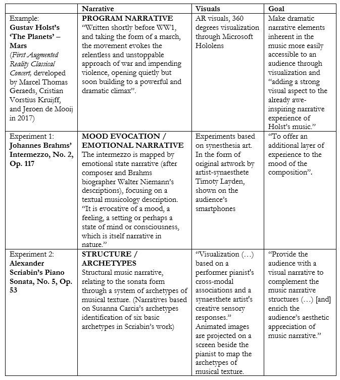 These examples show three different ways of looking for a musical narrative in the music. The first one by Holst is based on a narrative, the second one by Brahms is based on the mood of the composition, and the third experiment with Scriabin’s music is based on the musical structure and the archetypes within the composition. The visualization in two of the examples was created together with someone with synesthesia. All examples have the goal to offer a layer of experience to the audience or visualize the musical narrative to enrich the audience's experience.