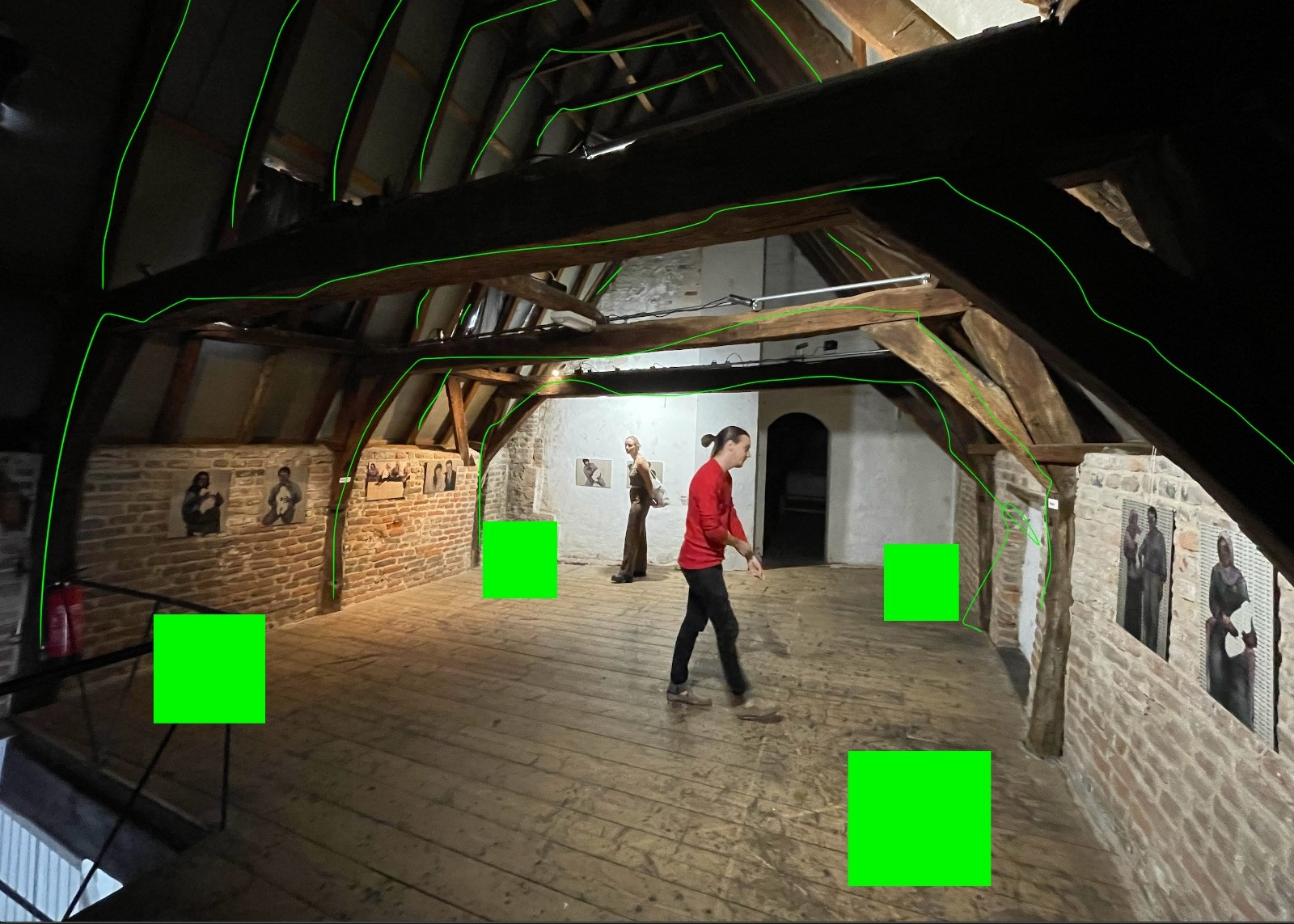 The visual development and thought experiments have resulted in a final idea to try out in the live experimentation phase, as explained in the following chapter: an LED installation, mounted at the beams of the attic space where the performance takes place. Firstly, this idea comes from the thought of using the space itself as an LED installation, instead of putting a stand-alone LED sculptor in the room, as mentioned in the visual thought experiments. Secondly, it comes from the idea of creating the architectural outline of a cathedral with light, inspired by the narrative ideas of the harp sonata. The idea started with having the LEDs go from the floor of the space to the ridge of the attic 6 meters above the floor. This would have created a cathedral-like shape. Due to practical and budget reasons (as we decided to work with pixel-animated LEDs[40], which are more expensive than ‘normal’ LEDs), it has resulted in the shape that can be seen in the video in the next chapter. The LEDs are programmed by Sebastiaan through TouchDesigner and MadMapper and will be controlled by him during the actual performance.