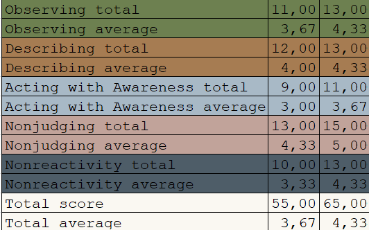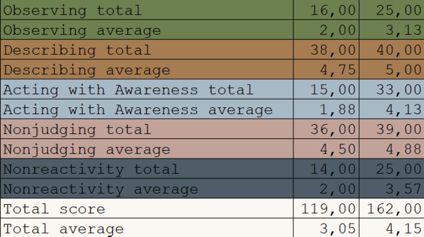 The total averages of both questionnaires increased by more than 0.5 out of 5, which is more than 10% of the total possible score (Table 7, Table 8). In the FFMQ, the biggest increase was observed in the acting with awareness facet, followed by nonreactivity and observing (Table 9). In the MfM, the biggest increase was observed in the nonreactivity facet, followed by observing, acting with awareness, and nonjudging (Table 10).