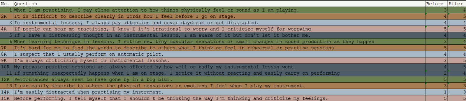 I have also noticed a major improvement in self–perception and mood regulation. In the self–experimentation log, I have noticed that my self–perception and mood were no longer dependent on teachers' approval or the quality of playing. Even if I received negative feedback or was unhappy with my playing quality, it took me less time and effort to come back to normality. Self–perception and mood regulation improved not only regarding lessons but also performances. I have observed improvement in the lessons and the performances not only in the self – experimentation log and weekly questionnaire, but in FFMQ and MfM as well. The improved score in the nonjudging facet in both questionnaires, where such statements as "I criticize myself for having irrational or inappropriate emotions" and "I'm always criticizing myself in instrumental lessons" are present, shows less judgment, more self–acceptance, and better self–perception.