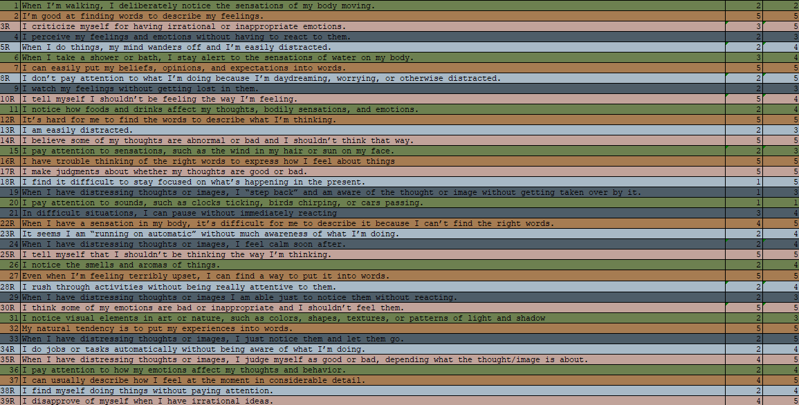 To conclude the data gathered from the self–experimentation log, weekly questionnaires, FFMQ, and MfM, it can be said that I have noticed a significant difference in my ability to deal with the mental challenges of being a musician. Both guided general and music–oriented meditations proved to be a valuable measure to improve my focus during daily practice sessions. I measured this difference by using my self – experimentation log, weekly questionnaires, as well as the acting with awareness facet in the MfM and FFMQ. The improvement in the scores when evaluating such statements as the MfM’s "I'm easily distracted when practising my instrument" and the FFMQ’s "When I do things, my mind wanders off and I’m easily distracted" shows an improved ability to stay concentrated and greater resilience to distractions. The improvement in the scores for certain observing statements of the MfM (such as "When I am practising, I pay close attention to how things physically feel or sound as I am playing") also shows deepened levels of concentration.