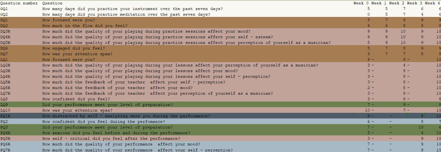 In case a lesson happened on that given day, I would also log my focus levels during the lesson, my self-perception, self-esteem, confidence, and level of performance in comparison to what I could have done during my private practice sessions. Similar aspects were logged in case a performance happened on that particular day as well, with the addition of logging my levels of anxiety, being distracted by self-analyzing during the performance, and self-criticism after the performance.