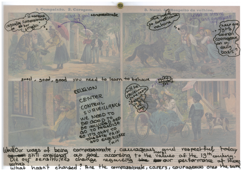 "the archive that I imagine to unlearn the archive" is both a research output and a method. Driven by the idea of unlearning as a transformative, post-colonial pedagogical practice, I began to think about whether and how an archive could become a site for critical knowledge production in arts education and in the history of education, rather than just documenting my research process. There is a slight irony, seemingly a paradox in the title of this archive: "the archive that I imagine to unlearn the archive". Unlearning while practising it? The idea is not repetition, unless it is considered repetition in variance, never settled, never fixed. It speaks to my attempt to unlearn hegemonic ways of seeing and educating and to provide pedagogical encounters that foster such unlearning in the fields of arts education and history of education. the archive that i imagine to unlearn the archive makes a contribution to research that interrogates the archives that we as arts educators inherit and raises questions about the purposes and ways of doing histories. I developed a performative-archival practice as a research methodology that combines visual culture inquiry, post-colonial pedagogy and arts-based practices. "the archive that I imagine to unlearn the archive" departs from two series of object lesson picture books of the so-called object lesson method (Pt. lições de coisas, Germ. Anschauungsunterricht) from the long 19th century that circulated across Imperial Europe as performative scores. The archive is invested in the study of visual representations of modern/colonial Nature and childhood, in the history of visual pedagogies and in how reform education was involved in producing the imperial citizen “at home”. This work was supported by FCT - Fundação para a Ciência e Tecnologia, I.P. under the project with the identifier DOI https://doi.org/10.54499/2022.12937.BD.