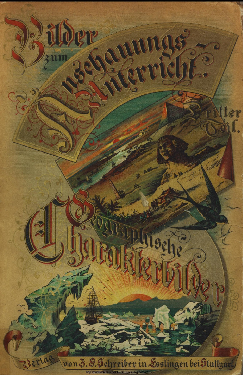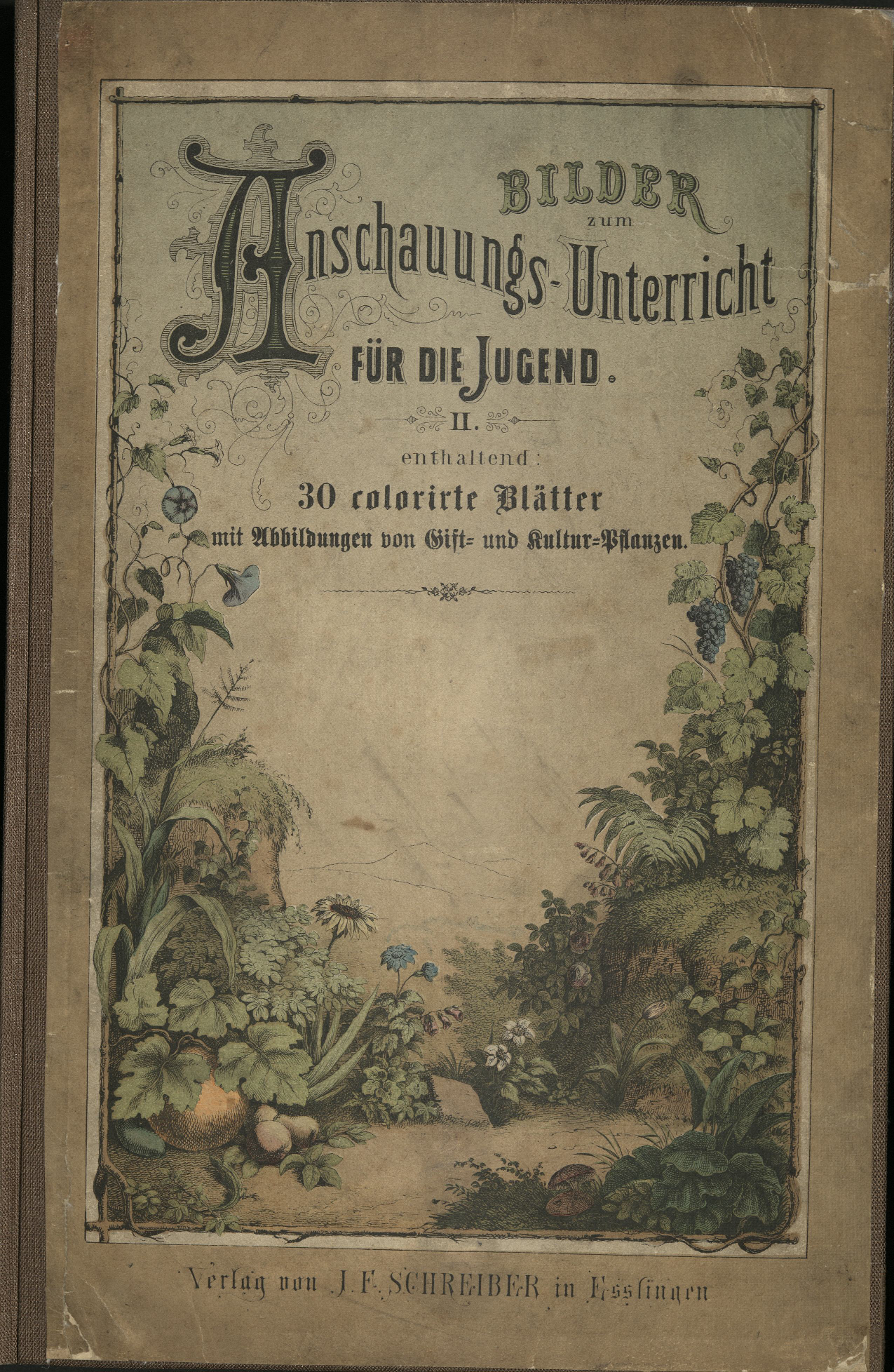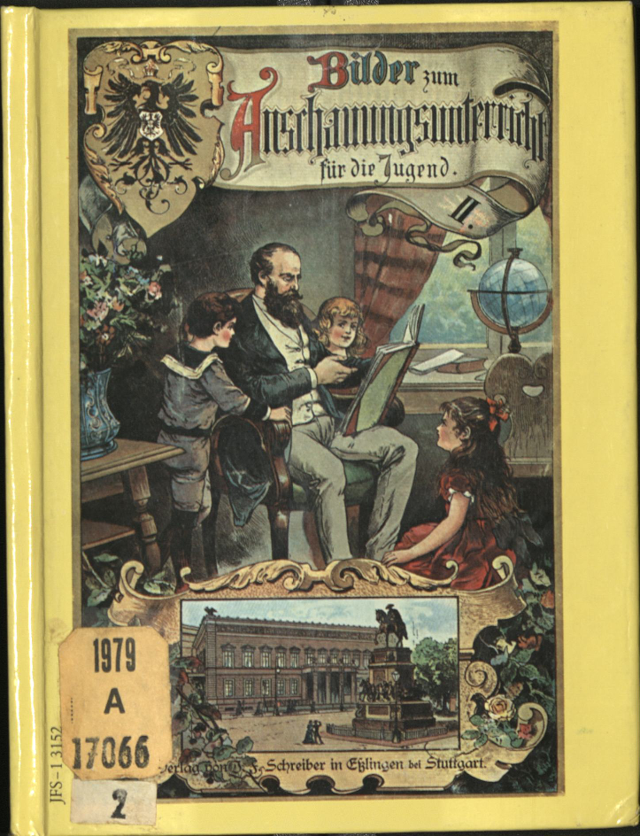 The second series of picture books was published by the J.F. Schreiber Verlag based in Esslingen/Stuttgart, Germany, between 1889 and 1891. The teacher and scholar Eduard Walther re-edited previous versions of Bilder für den Anschauungsunterricht [Pictures for Object Lessons]. The editor’s program listed many similar titles over the years; some of them have been republished in different formats at a much later moment. I study in particular the following four books: Bilder zum Anschauungsunterricht für die Jugend. Teil I [Pictures for Object Lessons for the Youth. Part I] and Teil II [Part II] (Walther, 1889a, 1889b), Bilder zum Anschauungsunterricht. Teil II: Tiere und Pflanzen [Pictures for Object Lessons. Part II: Animals and Plants] (Walther, 1891a), and Teil III: Geographische Charakterbilder [Part III: Geographical Character Images] (Walther, 1891b).
