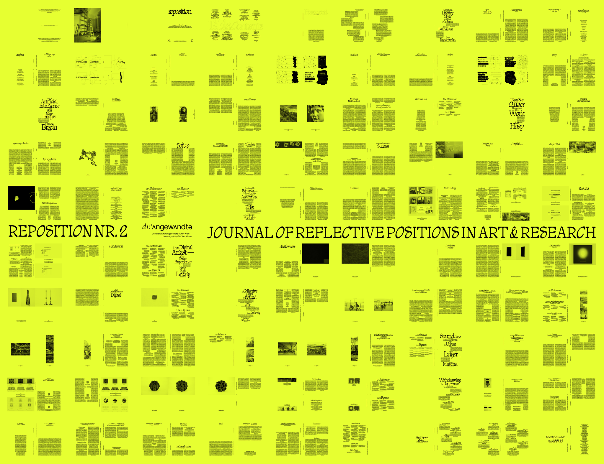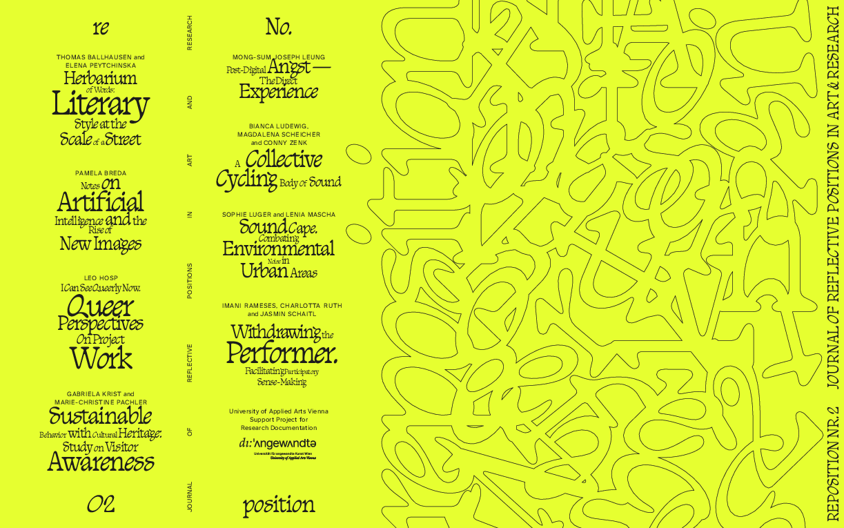 reposition was founded in 2022 to present diverse research approaches at the University of Applied Arts Vienna. The journal is open to all topics and disciplines at the Angewandte, and to researchers of all levels. We seek to shed light on a research environment that is diverse, personal, and critical. We also want to facilitate dialogues between existing theoretical and methodological positions in order to enable a challenging and dynamic research discourse. We are utilizing the Angewandte’s environment to stimulate connections, discover new positions, repositions and personal encounters. We seek to further develop peer culture and enable research.