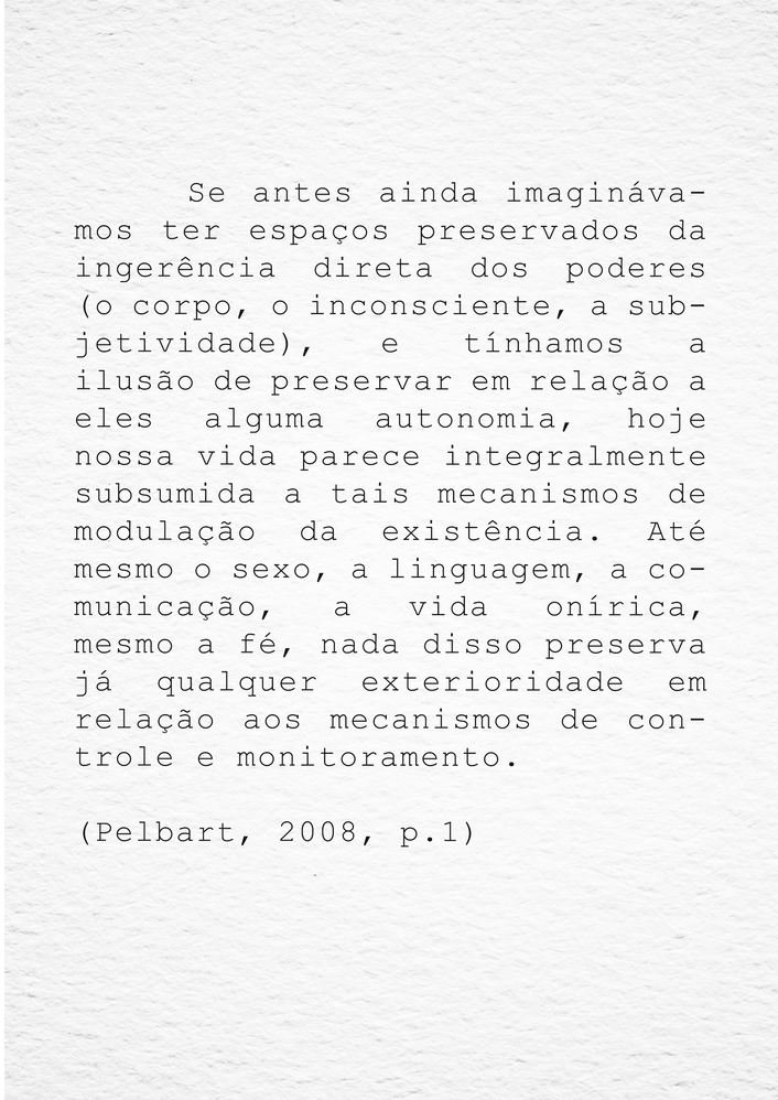 O tempo à deriva molda a pele do meu rosto, novas linhas de um constante rito do desfazer. Recolho e analiso cuidadosamente os fragmentos que sobram destes desencontros, dos deslocamentos por este não lugar, confronto com minhas memórias numa incansável tentativa de me reconhecer. Já não sou, já não reconheço. Corpo vagante sem memória.