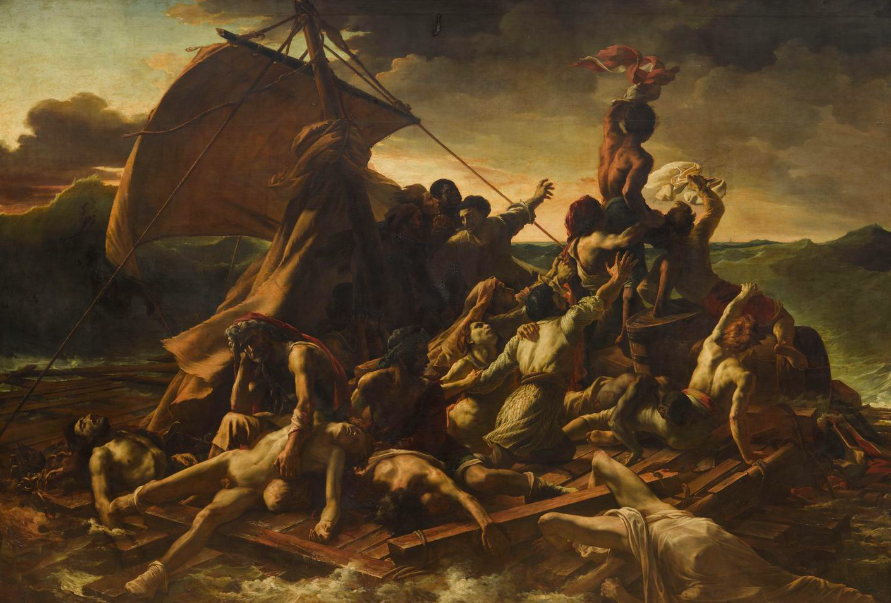 Em 1818 Gericault decide pintar sobre um acontecimento verídico, o relato de uma jangada de sobreviventes de um navio frances “Meduse” que tinha acontecido apenas dois anos antes. Os náufragos construiram uma plataforma simples com as madeiras do barco onde seguiam, 3 barris de agua doce e poucas bolachas. O que terá interessado ao pintor este tema? O mais intenso exemplo de miséria humana, mas, agora representado num momento de salvação, onde, perante a adversidade, todos os homens se tornam iguais, numa sociedade divida pela classe e pela raça. O retrato é um de ingenuidade e miséria, mas olhando com respeito e amor.