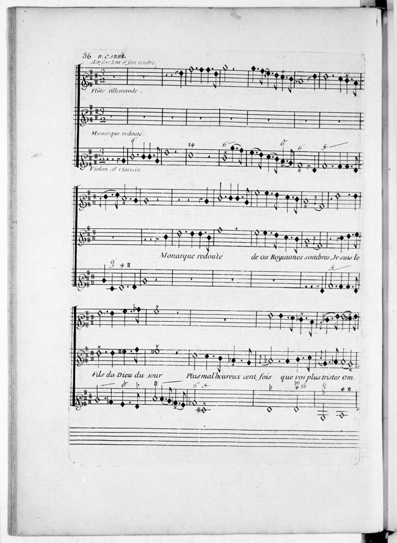In the air 'Monarque redouté' With the sound of the flute, Orphée presents himself as the son of Apollon and as a mourning lover, to Pluton, to attempt to recover Euridice from the underworld. Clérambault has chosen the unusual key of B Major with a bass line played on the violin and unison harpsichord, to set in sounds the fragility of the human voice addressing the monarch of the empire of shadows. In the Baroque flute the sharps are rather low in pitch making the keys with many sharps, for example, B major, extremely fragile in tuning and in sound due to the needs of many fork fingerings. The playing of many sharps creates, as it were, an “upward” way of playing in the performer (that is, to avoid the pitch from being too low), and at the same time a sense of extreme fragility and care for the sound. Both of these features fit remarkably with the character of pleading to the God of Hell. In that case, technique disappears behind the scene and the flute becomes a vehicle of the scene content.