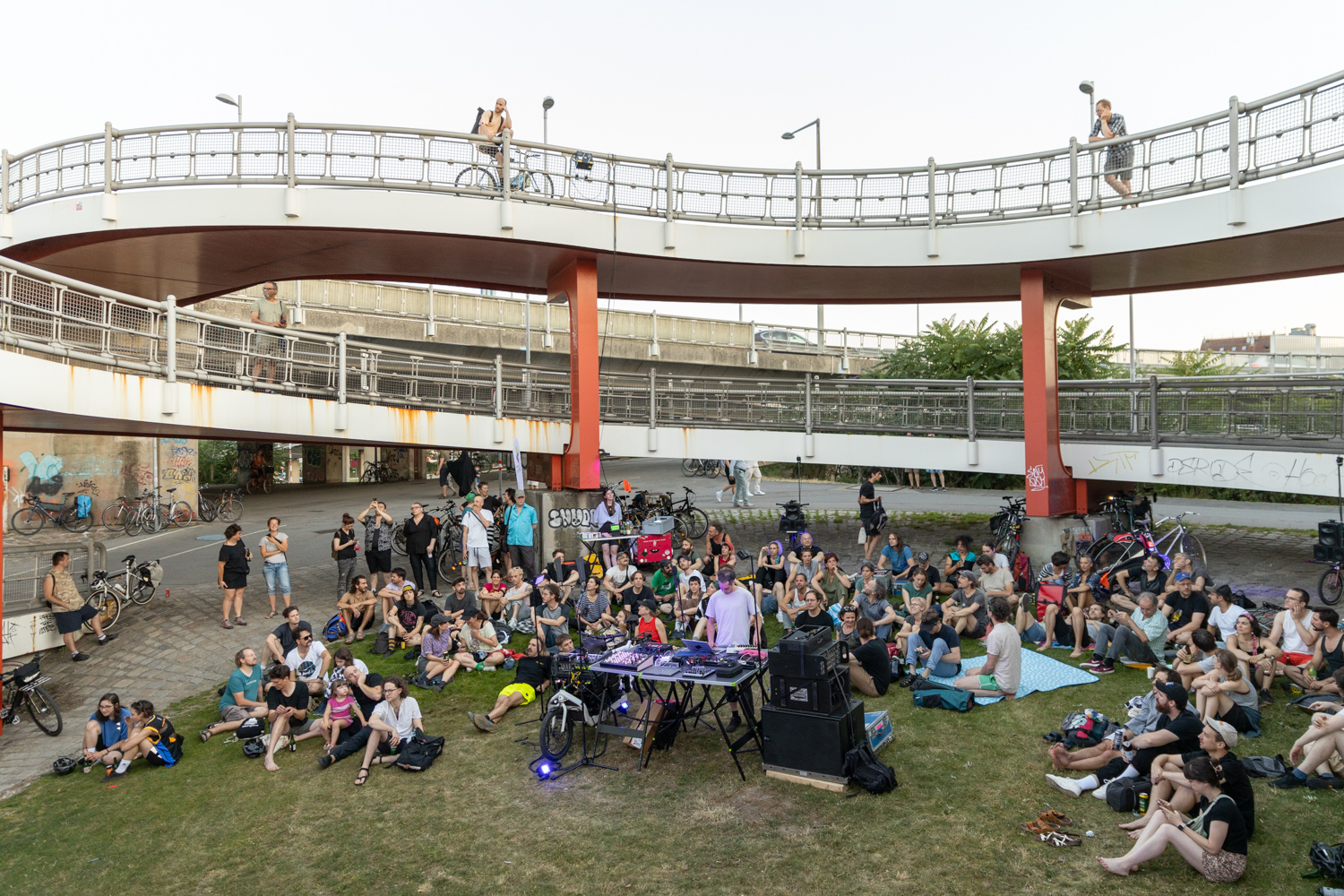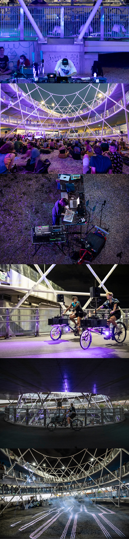The idea that performers ride up and down during each concert, carrying sounds through the levels of urban architecture creates a unique concert setting. The audience is free to move within the spiral or simply sit in the center and observe what is happening in and around the spiral. It is a traffic junction where a lot happens, both visually and acoustically. When a person on a skateboard passes by a Soundbike, or a car driving over the bridge, these sounds as the soundscape of the city, overlay and expand the composition and performance.