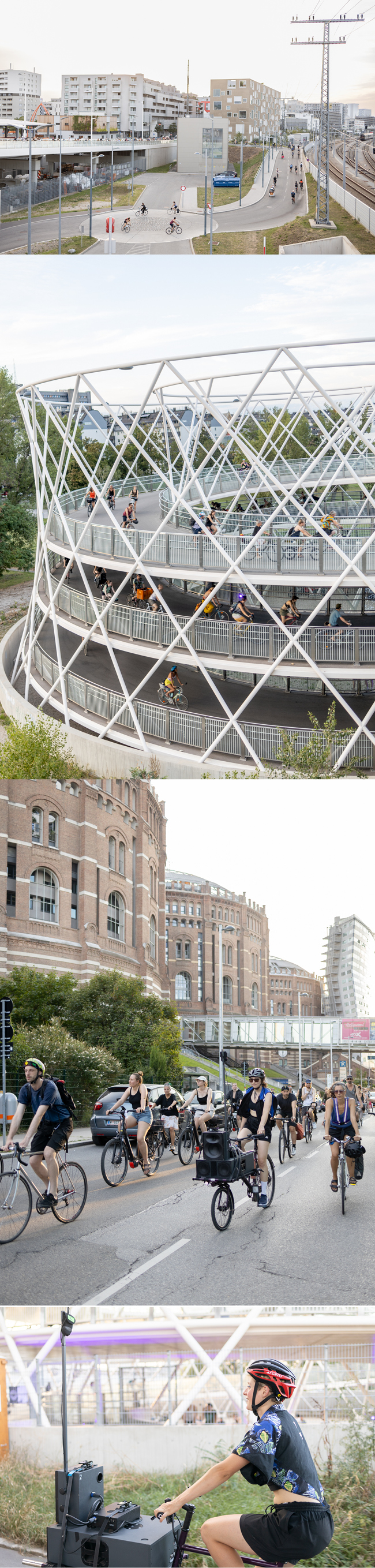SPIRAL BIKE was the first art project in the typically closed inner area of the bike spiral of Südbahnhof Bridge. Permission was required to enter the location. Rehearsals were possible with the agreement of the city of Vienna. However, many unknown parameters cannot be rehearsed, primarily because the concert space of the bike spiral also serves as a public space, and the bridge must remain accessible and open for regular traffic. Of course, this creates interesting situations and sounds as well. The surrounding and acoustic aspects of the architecture and the soundscape of the city, provide a setup for compositional ideas, movement, and choreography, as well as interaction and participation of the audience.