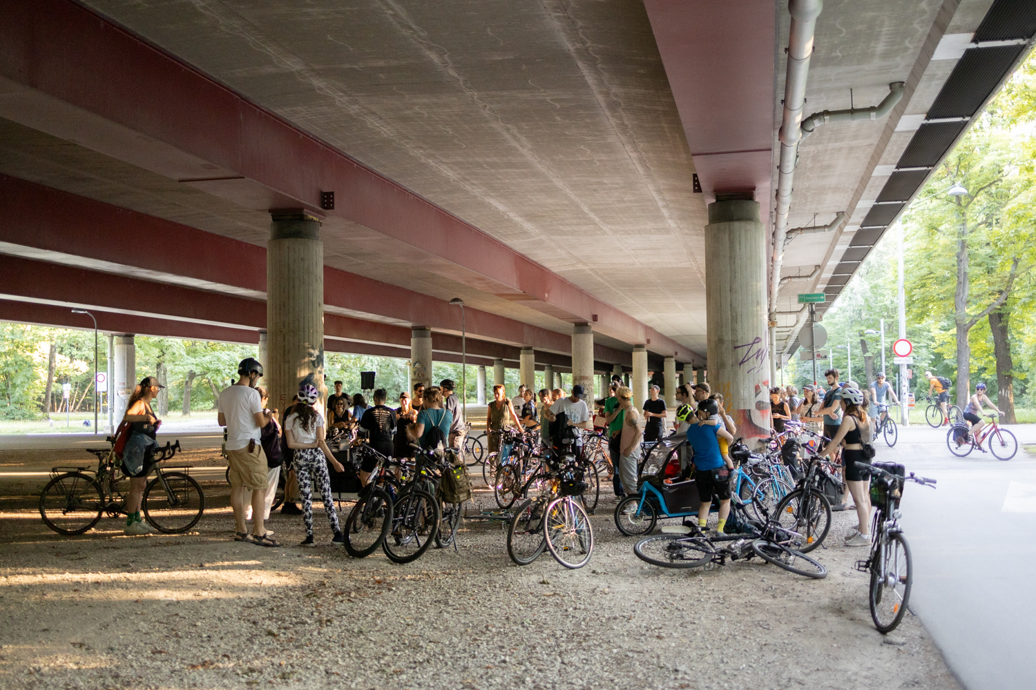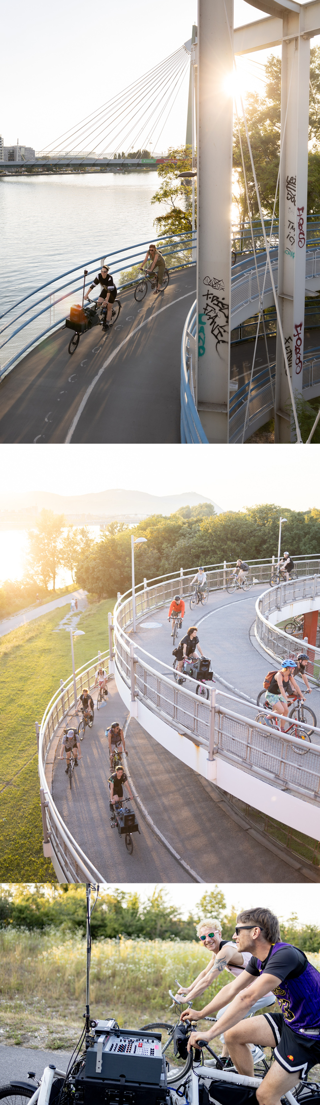 For your sound rides, you invited various labels, organizers, DJs, or musicians to arrange a special soundtrack for a route (e.g., Ventil Records, Global Fyre, Lauter Lärm, female:pressure), which took us to places that were mostly unknown to me, such as a container loading station or a beach on the Danube. Architectures were encountered in a new way, and sounds were experienced anew. The use of self-chosen musical accompaniment by cyclists is a new means of experiencing and negotiating the environment.