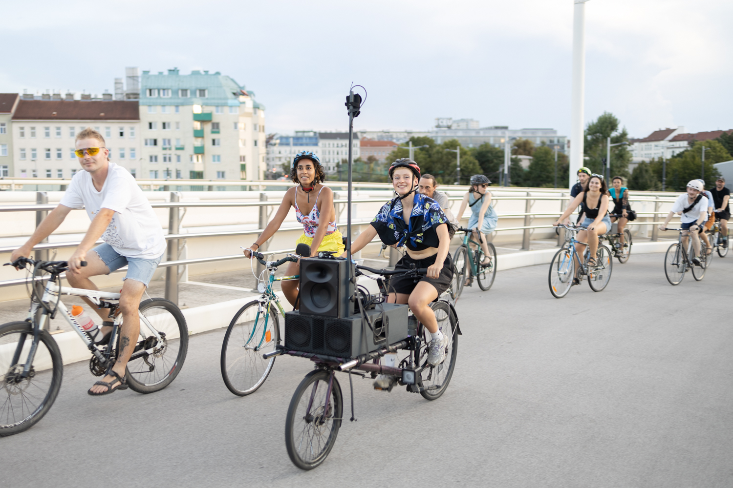 The short, almost flash mob-like appearance of a Soundride creates fascination and enthusiasm among passersby. Usually, a very diverse audience is joining the ride and therefore I pay particular attention to mixes of different styles and genres that are often post-pop or post-club and are, therefore, easier to access and very suitable for riding. Soundrides with Ventil Records,19 Eastbloc Sound,20 or arooo.records21 are also experimental examples of successful Soundrides with different labels and DJs from Vienna and abroad.
