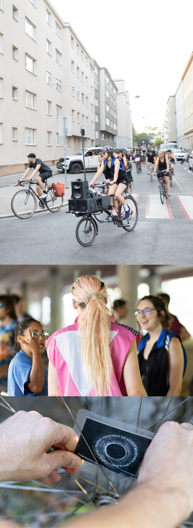 Inspired by the dense megacity and the weekly nightrides, I started to organize similar nightrides in Vienna in 2013. They took place on Thursdays because the Vienna Bike Kitchen was open that day, which was the starting point for our nightrides. The Vienna Bike Kitchen8 is a DIY bicycle shop where you can learn how to repair your bike. It is a very empowering environment and collective, and always open on certain days to address FLINTA* (female, lesbian, intersex, non-binary, transgender, agender persons). I knew of the Bike Kitchen and the Critical Mass beforehand, but something changed while organizing the nightrides. I think I discovered the bicycle as a medium, not just for exploring but also to produce art and sound. The first bicycle-related performance was named Art Ride X and it had the format of an alley-cat race but was not competitive and used the concept of checkpoints for artistic interventions. An alley-cat is a game or event similar to a treasure hunt and popular among bike messengers. Together with my artistic partner and collaborator for many years, Daniel Aschwanden, I eventually invited artists I was on tour within China, such as Soviet Pop, Li Qing, and Li Weisi, and various Viennese artists such as Matthias Hurtl and Gratis Kaiserin for music and performative interventions along the route.