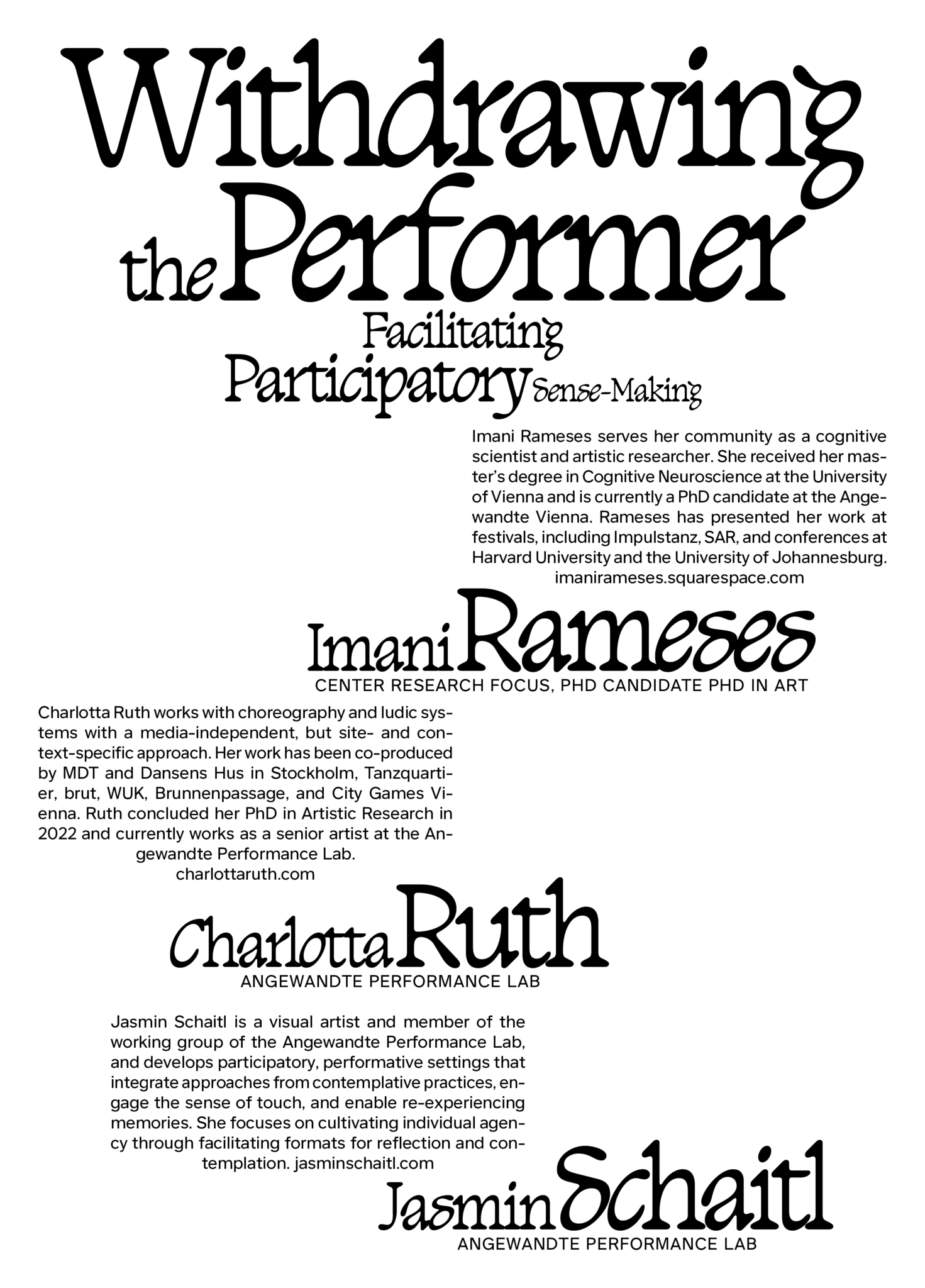 Apart from the person in the chair, another person in the room knew the answer to the participatory experiment. This person had planned and prepared the situation, opened the door, and now stood gently on the side, observing. This person, Philipp Ehmann, theatre maker and transdisciplinary multimedia artist, was one of six experts who were invited to share their facilitating practice inside the one-year pilot artistic research project WITHDRAWING THE PERFORMER at the University of Applied Arts, Vienna (November 2021 until November 2022).
