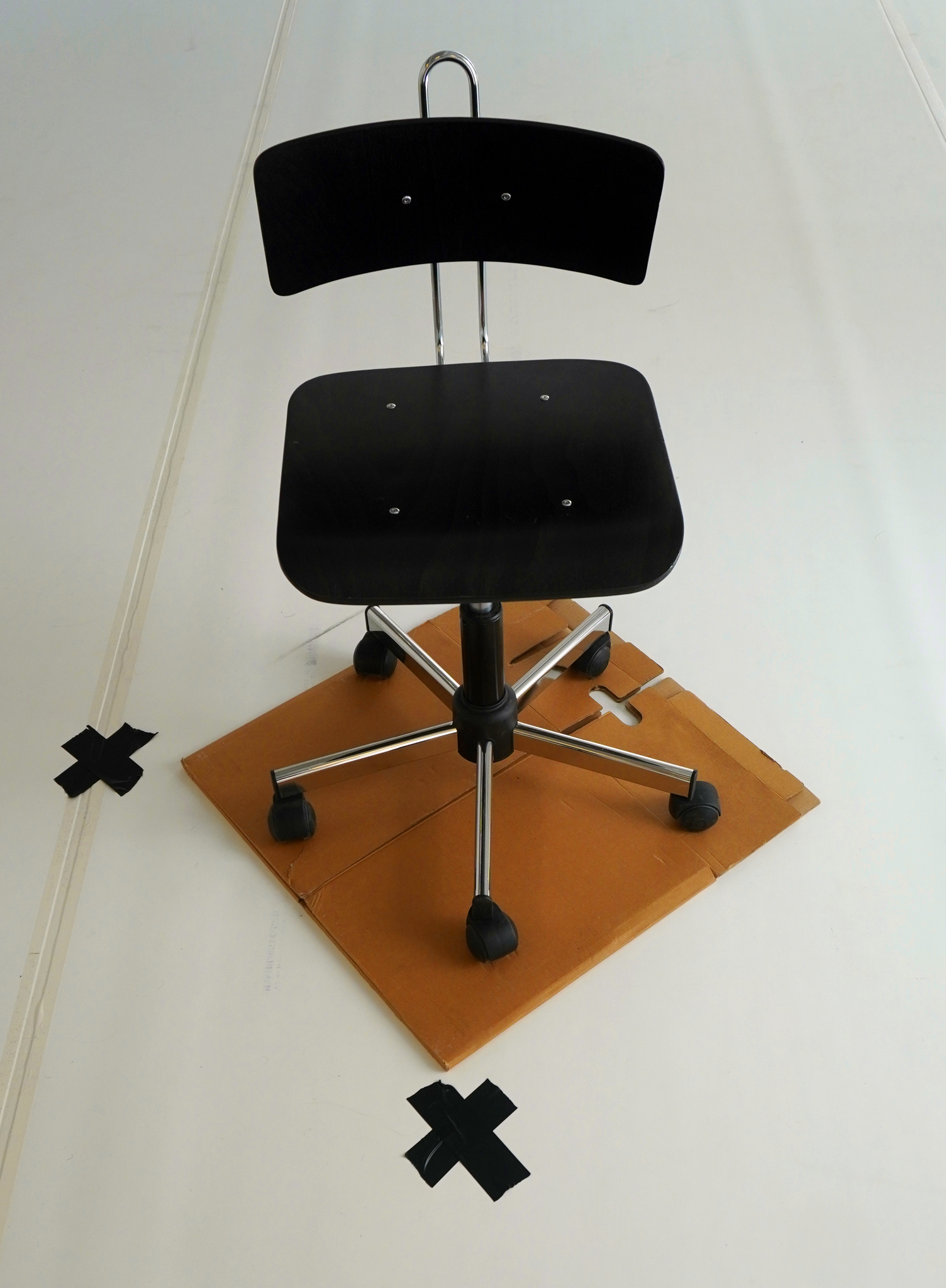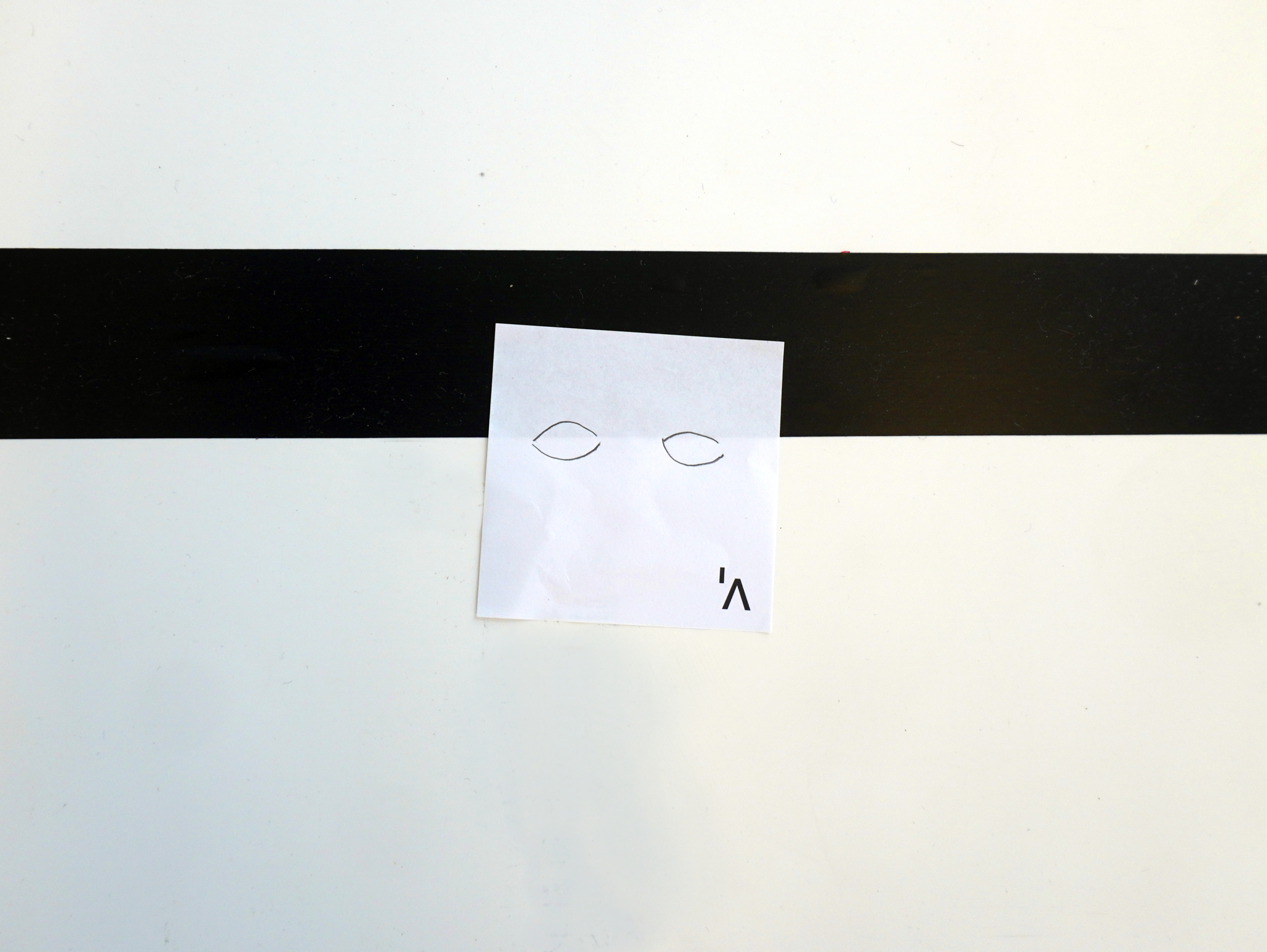 The door opens, and you and three other people enter a large white space. A person sits with their back straight in a plain office chair, located slightly off the room’s center. A black line taped on the floor separates you from the person. Two black crosses are taped on the floor, one situated on a diagonal angle away from the chair, the other closer to you but still behind the line. You have been given a small white card with a pair of eyes printed on it and instructed to engage with the situation.1