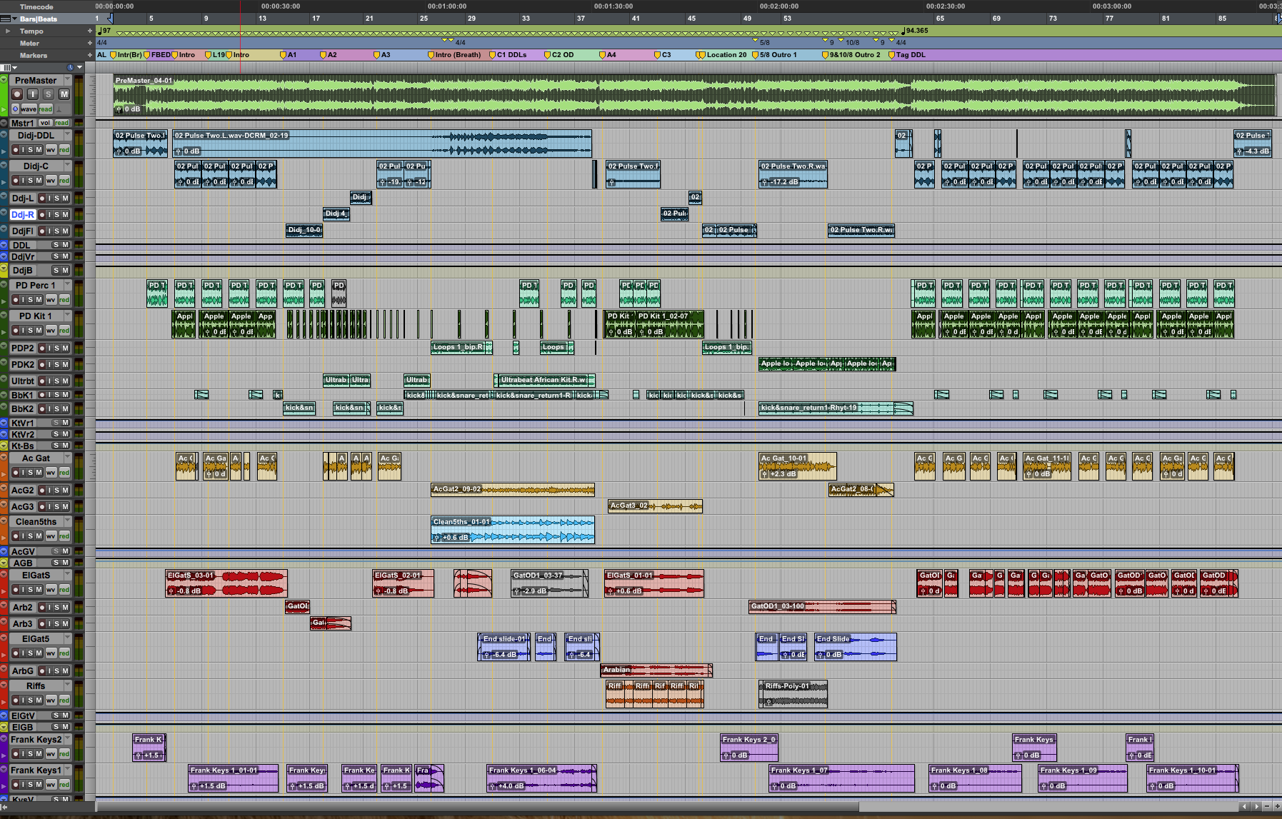 Figure 3: Additional drums, keyboards and guitars for Pulse Two (remix) in Pro Tools.