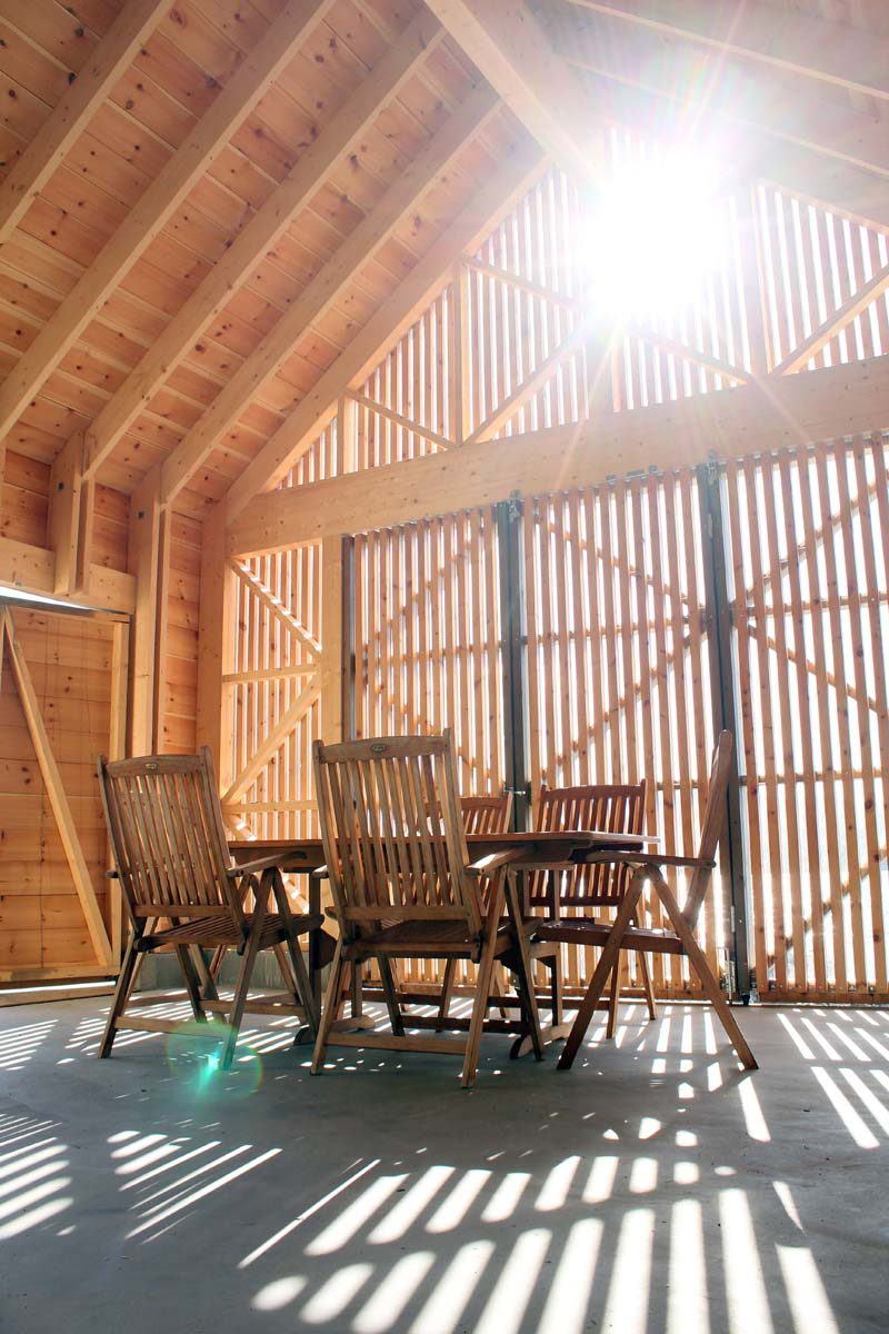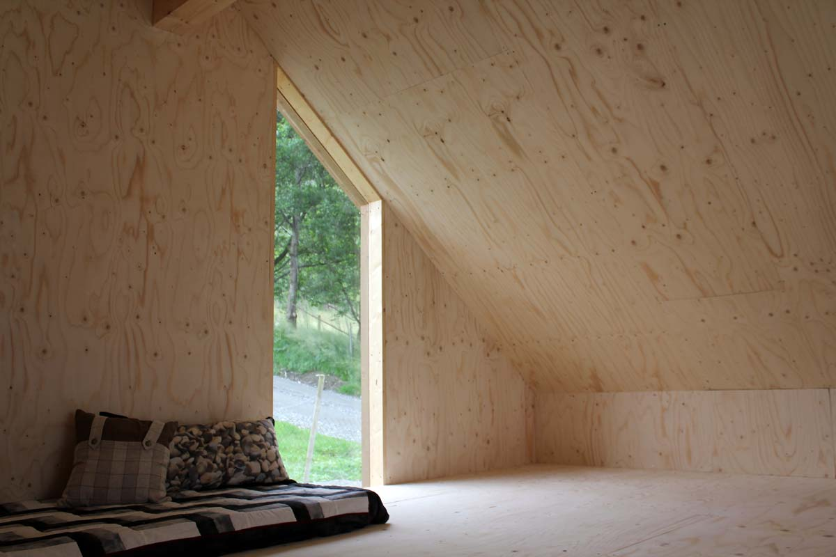 The south side of the boathouse has three doors that open towards a terrace and extends the interior floor of the boathouse. In the back, there is a small plywood cladded loft, which can be used as a private playground for the youths of the family or as a simple accommodation.