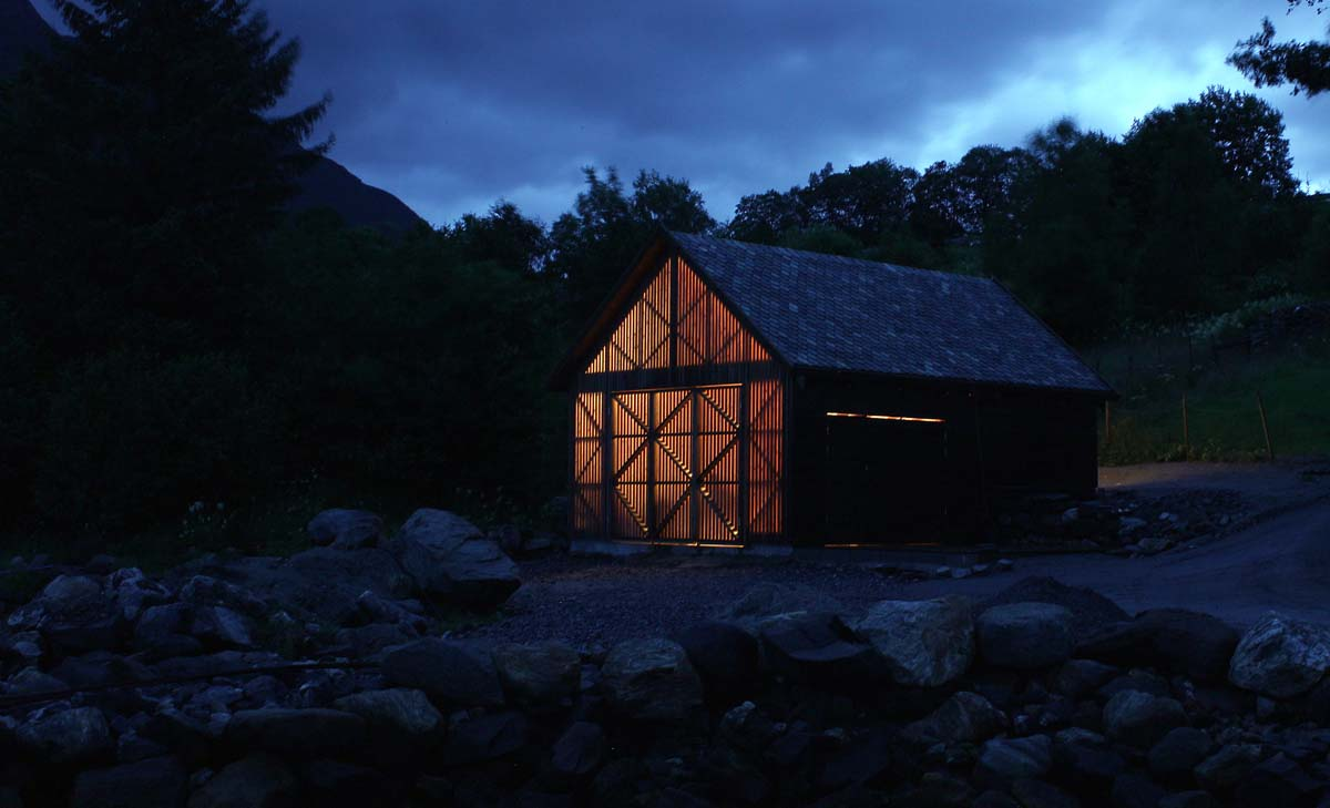 Nevertheless, the design of this boathouse is quite unique. The west facade, facing the fjord, has been clad using alternating pinewood boards and plastic glass. From inside, you get the beautiful view of the fjord, and it gives the interior space plenty of daylight. The exterior experience, though, changes during the day and from where you look at it. From the sides, it appears as a traditional boathouse, while viewing straight on, or at night, the plastic strips reveals itselves.