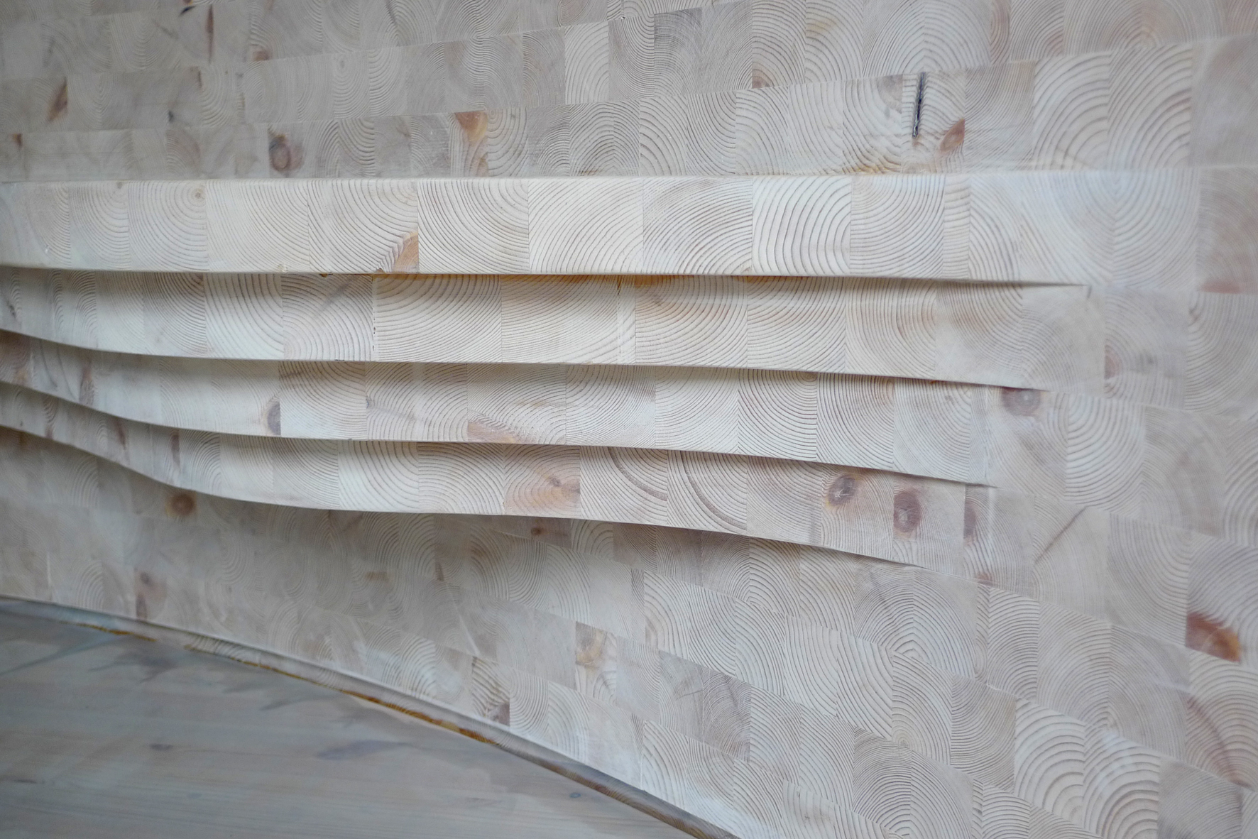FRIrom is built entirely in Norwegian wood and produced at Snekkeriet Verdal AS. All solutions are unique and designed specifically for this project. Using a digital model, the wood is milled out of 50mm thick sheets of laminated pinewood. The annual growth rings in the wood create a variation in the expression of the wall, where no spots are equal. Floor and roof construction are milled out of solid wood panels, also pine.The pavilion is insulated with Hunton wood fibre insulation, which is recyclable and has a heat storage capacity that is the double of normal mineral wool. The facade is braided from aspen, a strong wood that is pliable enough to be woven.