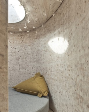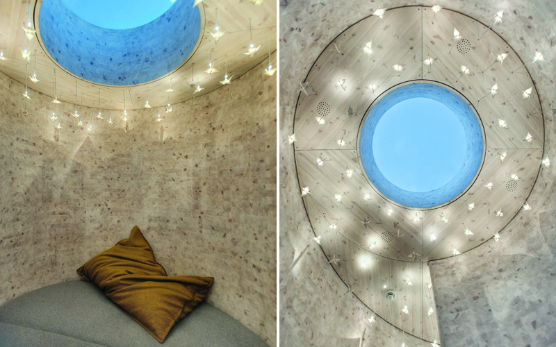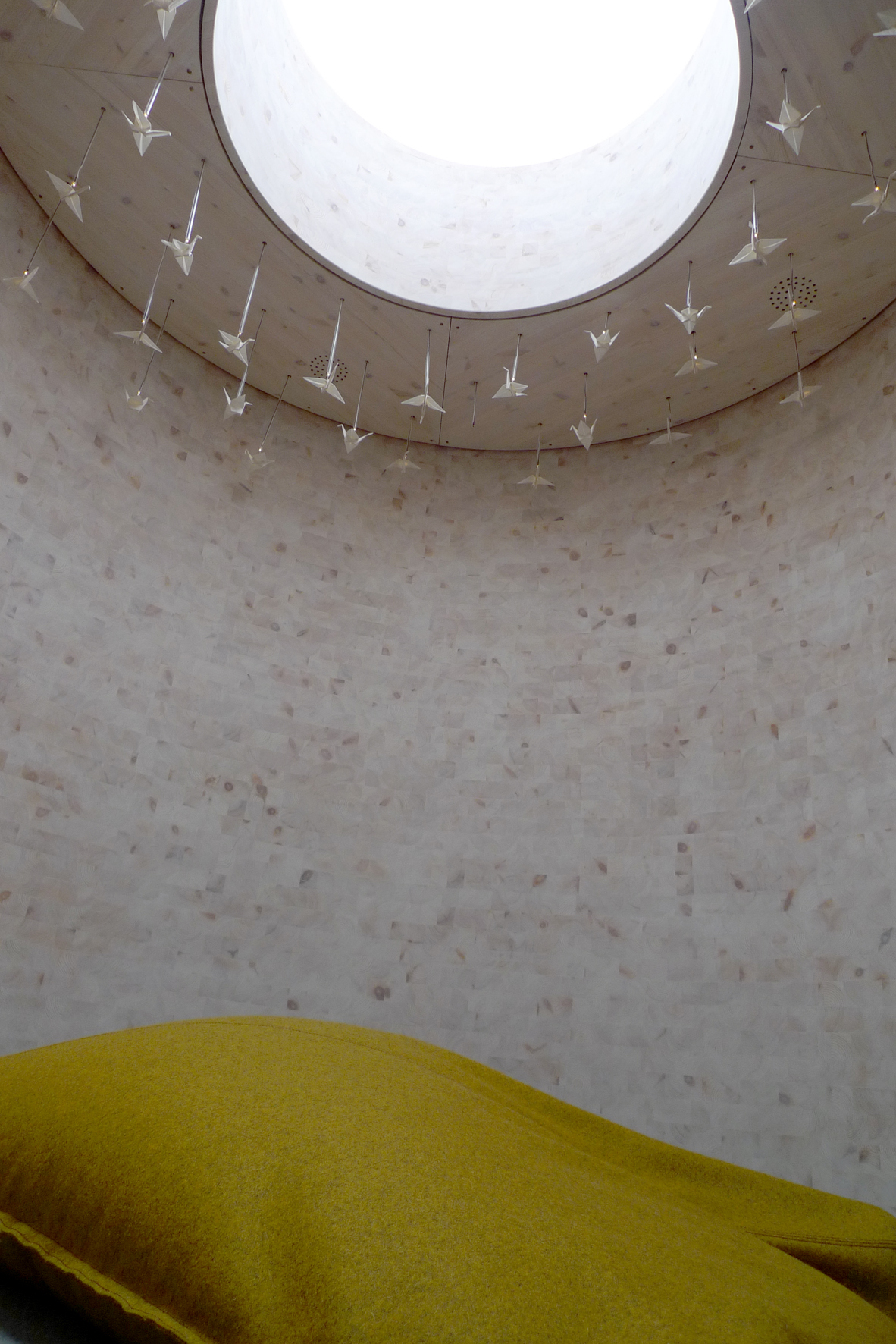 During the design process we seeked back to some of the “original” instruments that affect us; the light, the sky and natural materials. The pavilion is shaped like a spiral with an inner circular space. The shape encloses you and gives you control over the environment. A mattress fills the circular space; a flexible piece of furniture, which, together with a large pillow, provides the user freedom in use of FRIrom. The experience of FRIrom varies throughout the day and year. During the day the centered skylight gives focus to the sky and the light that is constantly changing. When darkness comes, the lit origami ceiling becomes more visible and you get a feeling that the room height is lowered. Origami is an ancient Japanese art form associated with happiness and hope. Children, relatives and collaborators have folded the cranes as a symbol of planting a hope in FRIrom.