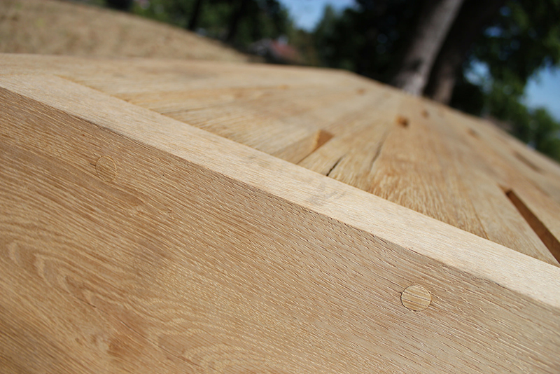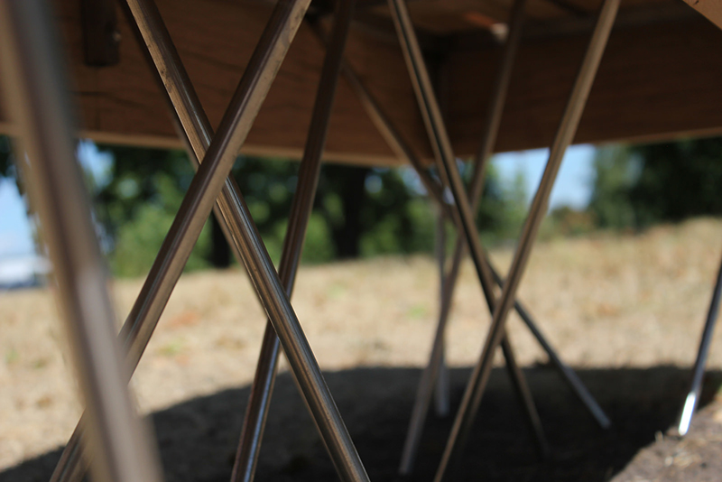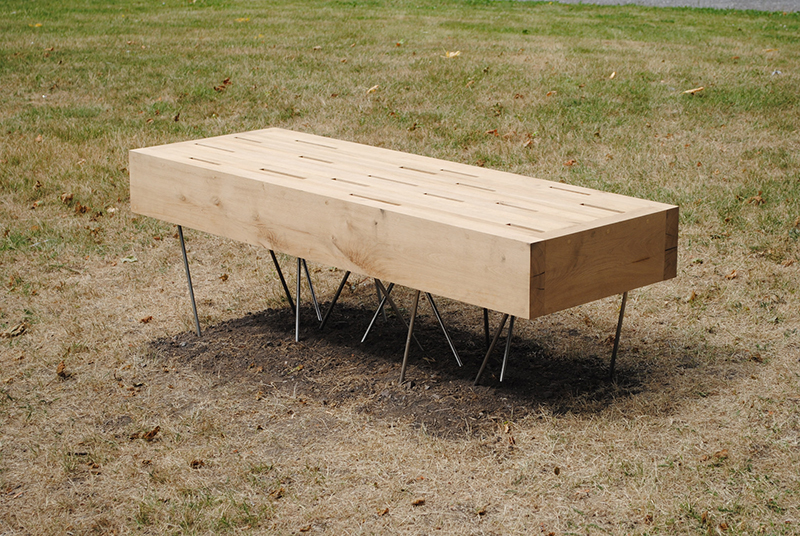 The bench top is a massive, heavy wood structure, sustained by thin steel bolts, seemingly placed at random. In reality the steel bolts are part of one balanced steel frame, partially buried and anchored underground.