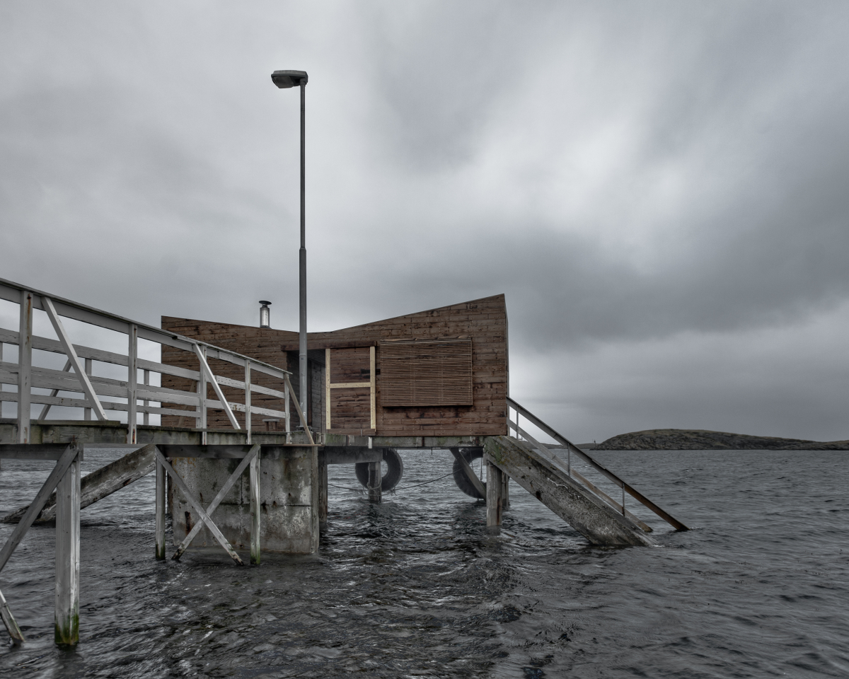 The building consists of three spaces: the main sauna room, the dressing room and the protected outdoor chill-out space inbetween them. When approaching along the pier from landside, this inbetween space frames the sea landscape and creates a welcoming effect. From here, one can also use the existing staircase to descend into water. Wood was used to all parts; Pine and spruce for structures and main surfaces, aspen for the sauna benches and kebony for the facades. Finally, to keep the the building in place in hard winds, the whole thing was bolted through the concrete deck.