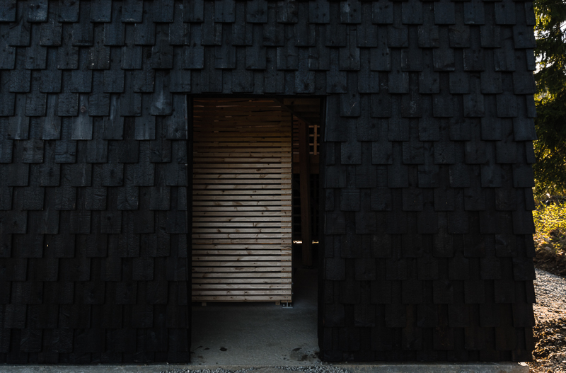 The students made everything themselves, from the steel connections and foundations to the roofing. Star Cube is clad with burnt shingles made from spruce. The burning process was inspired by the Japanese technique called Shou Sugi Ban, which protects the wood in addition to giving it a unique finish. Every shingle is burnt on both sides in order to create a stark contrast between the black cladding and the structural elements made of pinewood and glulam.