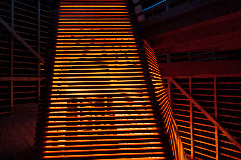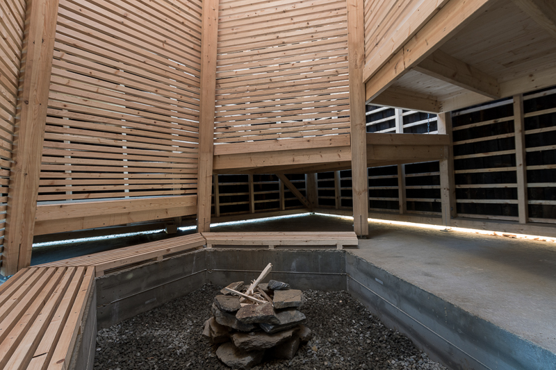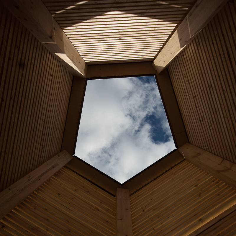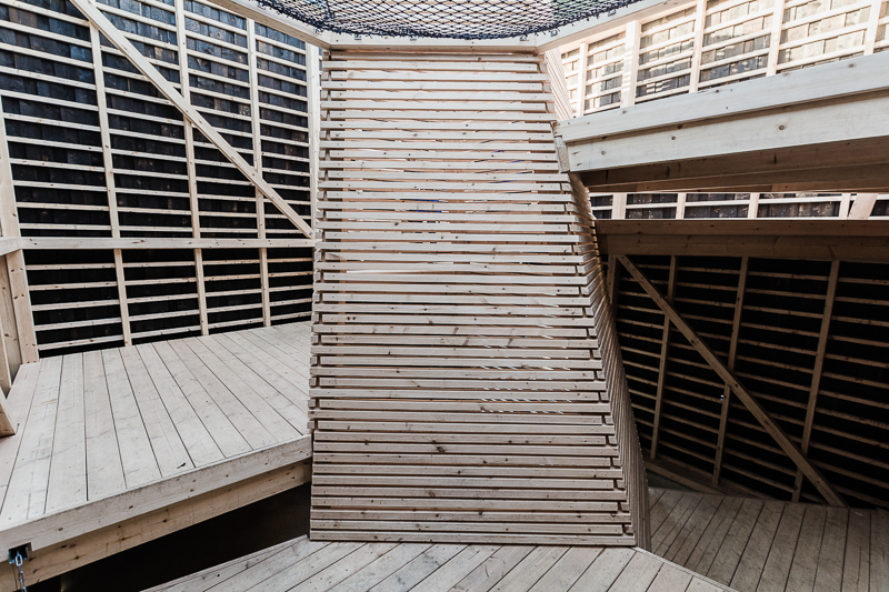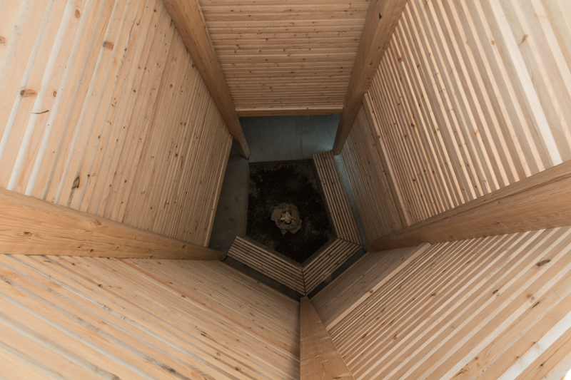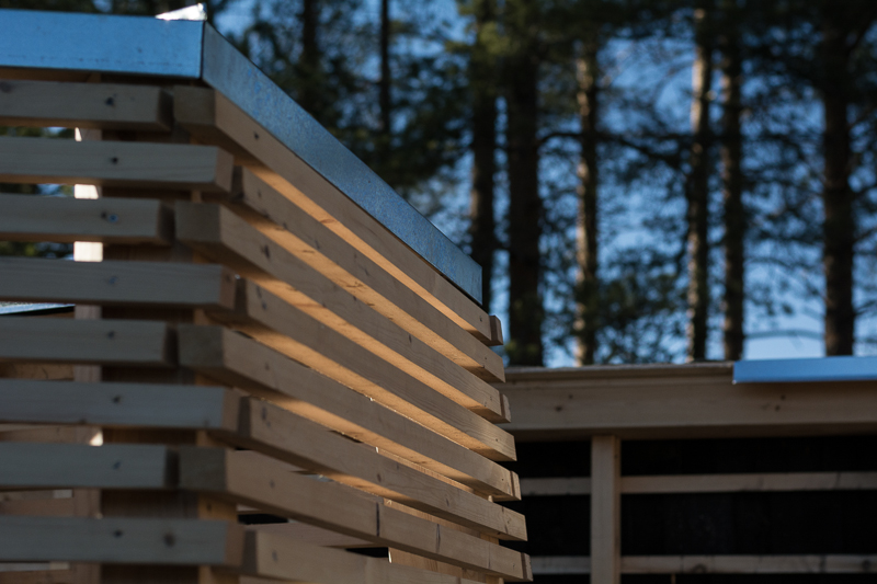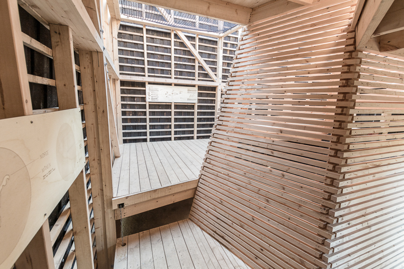 The building was completed in two weeks. Most of the elements were prefabricated in the University’s workshop, while everything was assembled on site. First the tilted glulam columns of the core were raised, followed by the main structure walls and finally the platforms were set in place between. Considering all the different angles of the project, each element had to be made very precisely in order to fit into the structure.