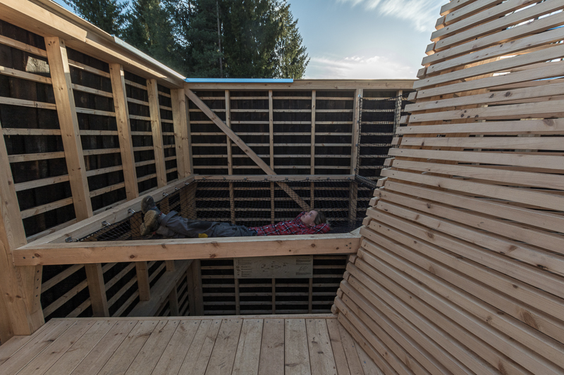stars by climbing up platforms. The final destination is a net where people can comfortably enjoy stargazing or looking at the sky. Inside the core of the building there is an intimate fireplace made for social gatherings or sleepovers.