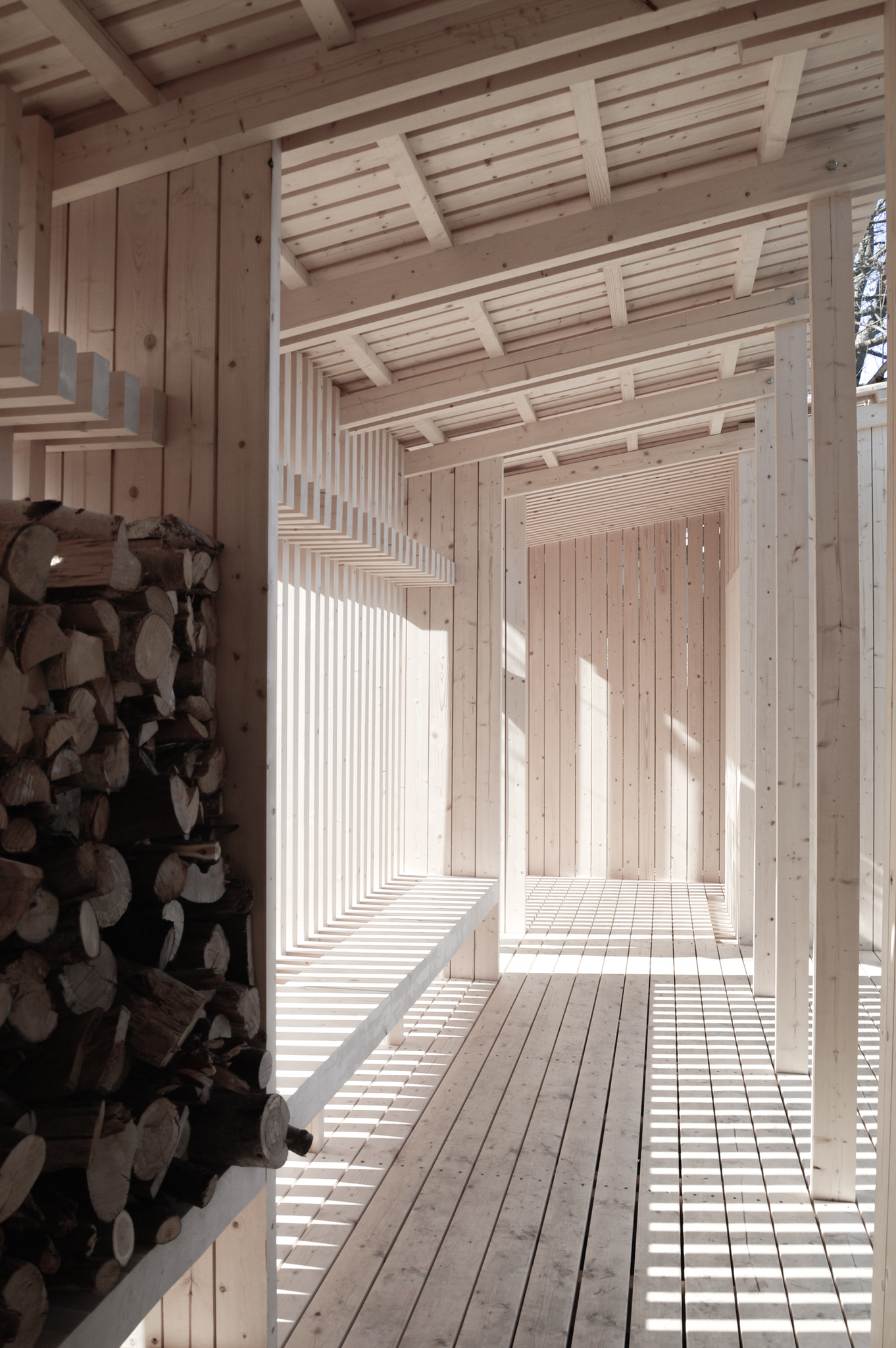 The plan is to open the view and form an intimate outdoor topa with a fireplace. The back wall is conceived to let the sun in from behind and reduce the vision into the patio. It also breaks the wind. This half transparent effect is reached by dissolving the original massive wood element into a structure with every second plank missing. This was even pushed further, using only a pillar and a beam as the load-bearing structure.