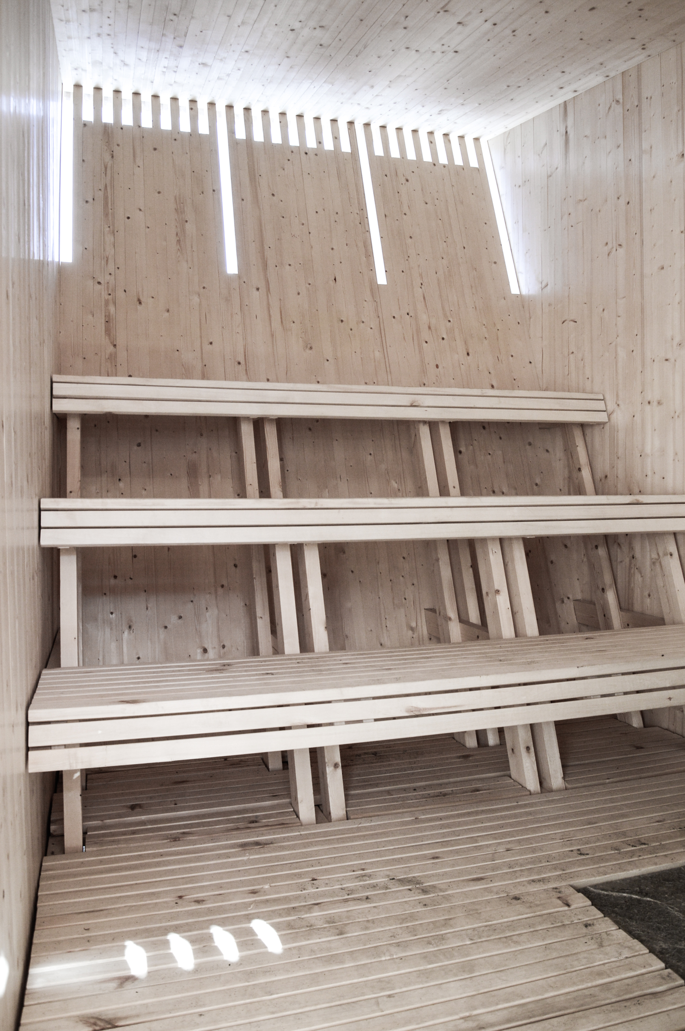 The shape of the sauna wall is designed to get most of the heat to the top bench where people are sitting. The slope of the wall also makes the benches more comfortable. This idea of using the slope of the sauna to create a place to sit we also made use of in our design of the changing room. Both of these volumes are covered with cladding only on the weather-exposed sides.