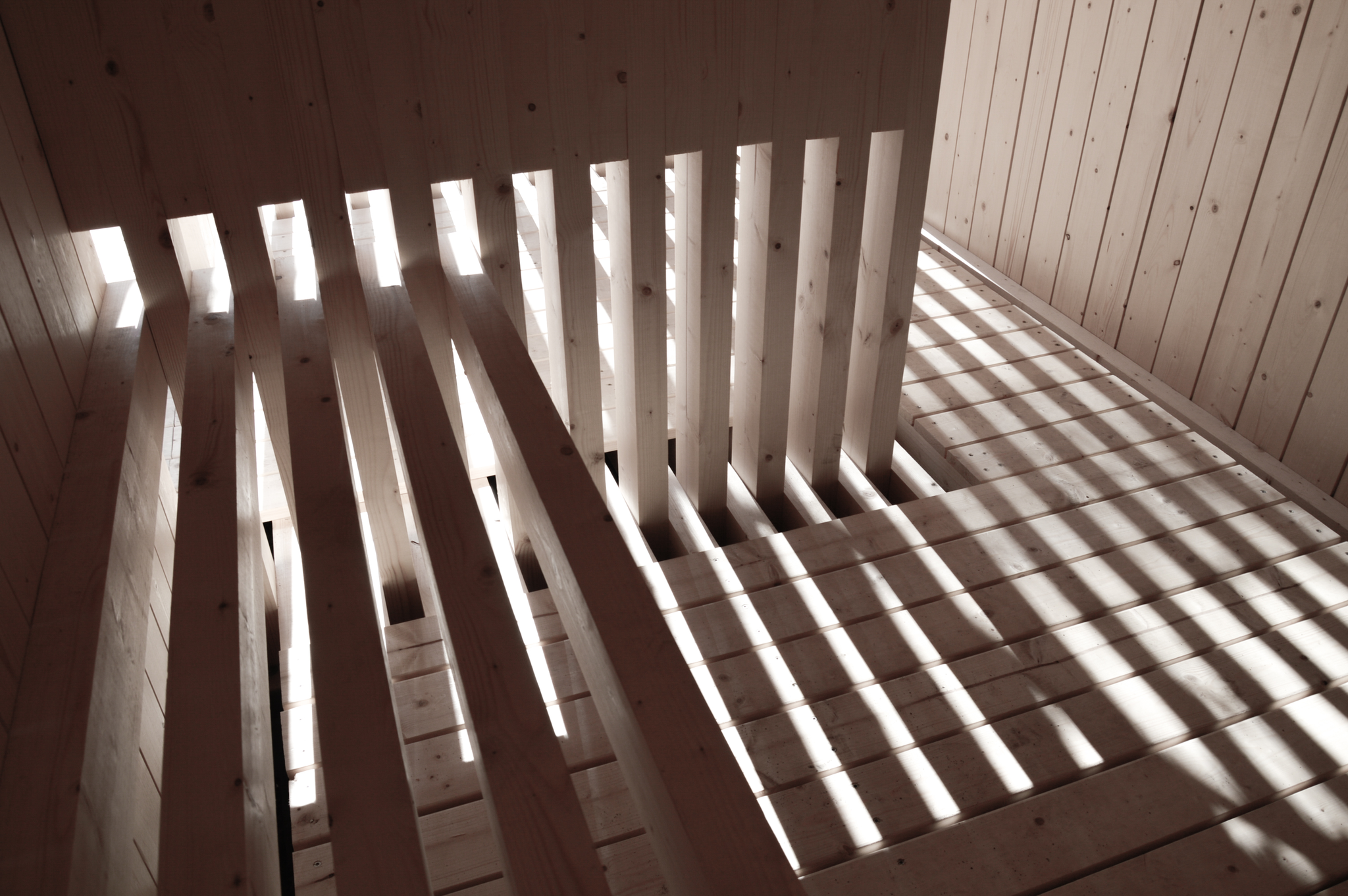 In the heated sauna, the massive wood walls are enclosed, but with every other board removed in the floor to ventilate. Every other board is also removed in the top of the northern wall to let in light and open for view.